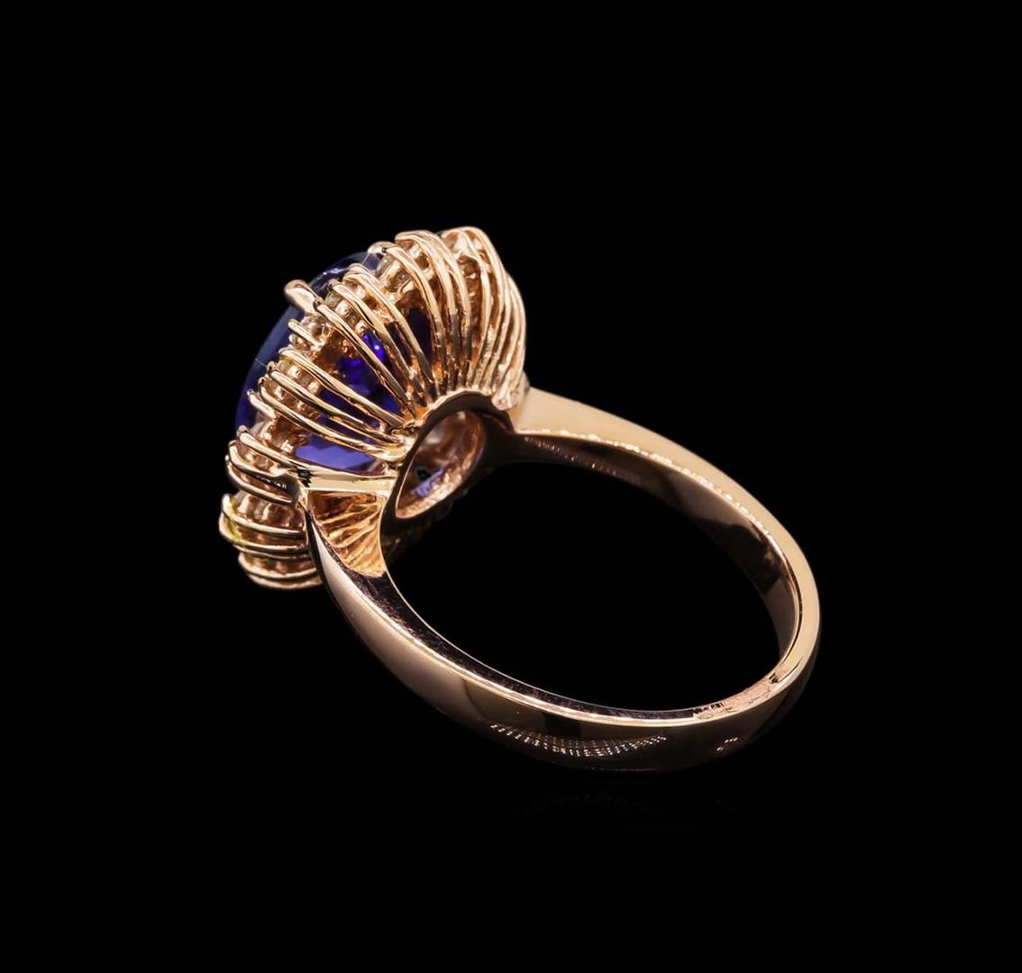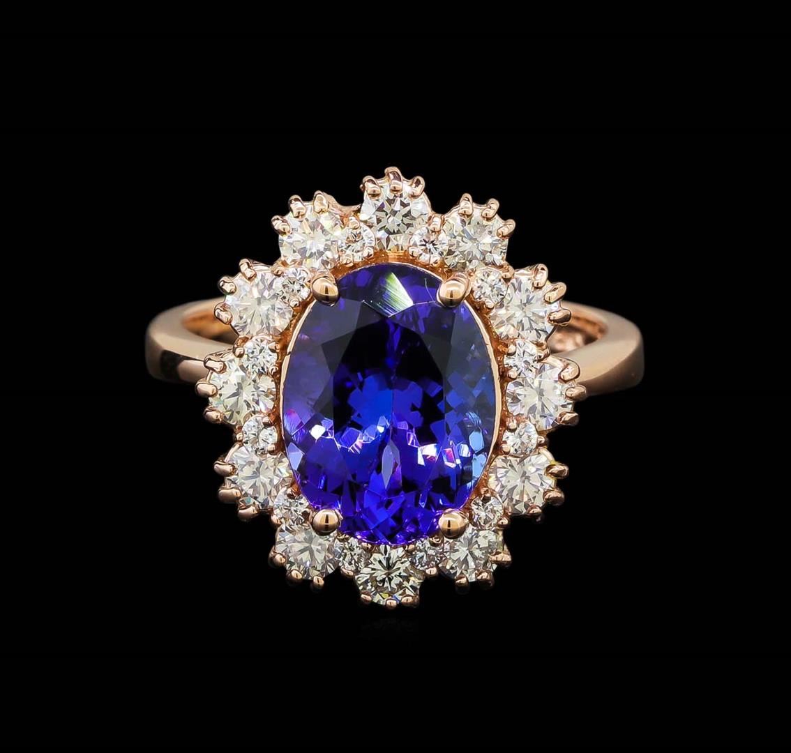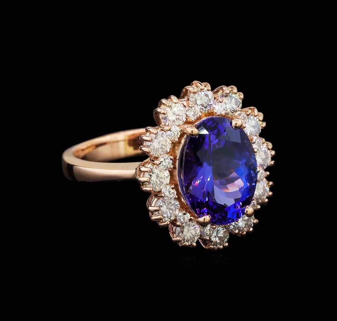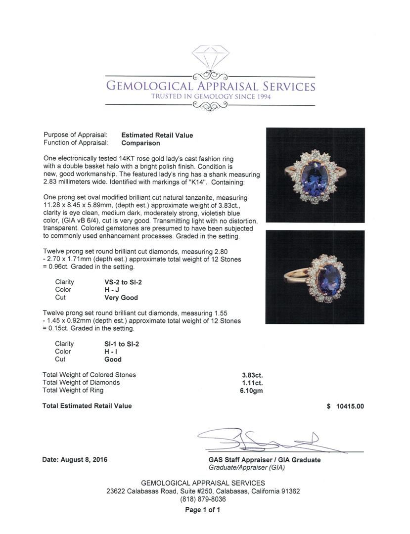 One electronically tested 14KT rose gold lady's cast fashion ring with a double basket halo with a bright polish finish. The featured lady's ring has a shank measuring 2.83 millimeters wide. Identified with markings of 'K14'. Condition is new, good workmanship. Containing: One prong set oval modified brilliant cut natural tanzanite, measuring 11.28 x 8.45 x 5.89mm, (depth est.) approximate weight of 3.83ct., clarity is eye clean, medium dark, moderately strong, violetish blue color, (GIA vB 6/4), cut is very good. Transmitting light with no distortion, transparent. Colored gemstones are presumed to have been subjected to commonly used enhancement processes. Graded in the setting. Twelve prong set round brilliant cut diamonds, measuring 2.80 - 2.70 x 1.71mm (depth est.) approximate total weight of 12 Stones = 0.96ct. Graded in the setting. Clarity VS-2 to SI-2. Color: H - J Cut Very Good Twelve prong set round brilliant cut diamonds, measuring 1.55 - 1.45 x 0.92mm (depth est.) approximate total weight of 12 Stones = 0.15ct. Graded in the setting. Clarity SI-1 to SI-2. Color: H - I Cut Good. Total Weight of Colored Stones 3.83ct.. Total Weight of Diamonds 1.11ct.. Total Weight of Ring 6.10gm. GAS Appraised at $10,415.00.