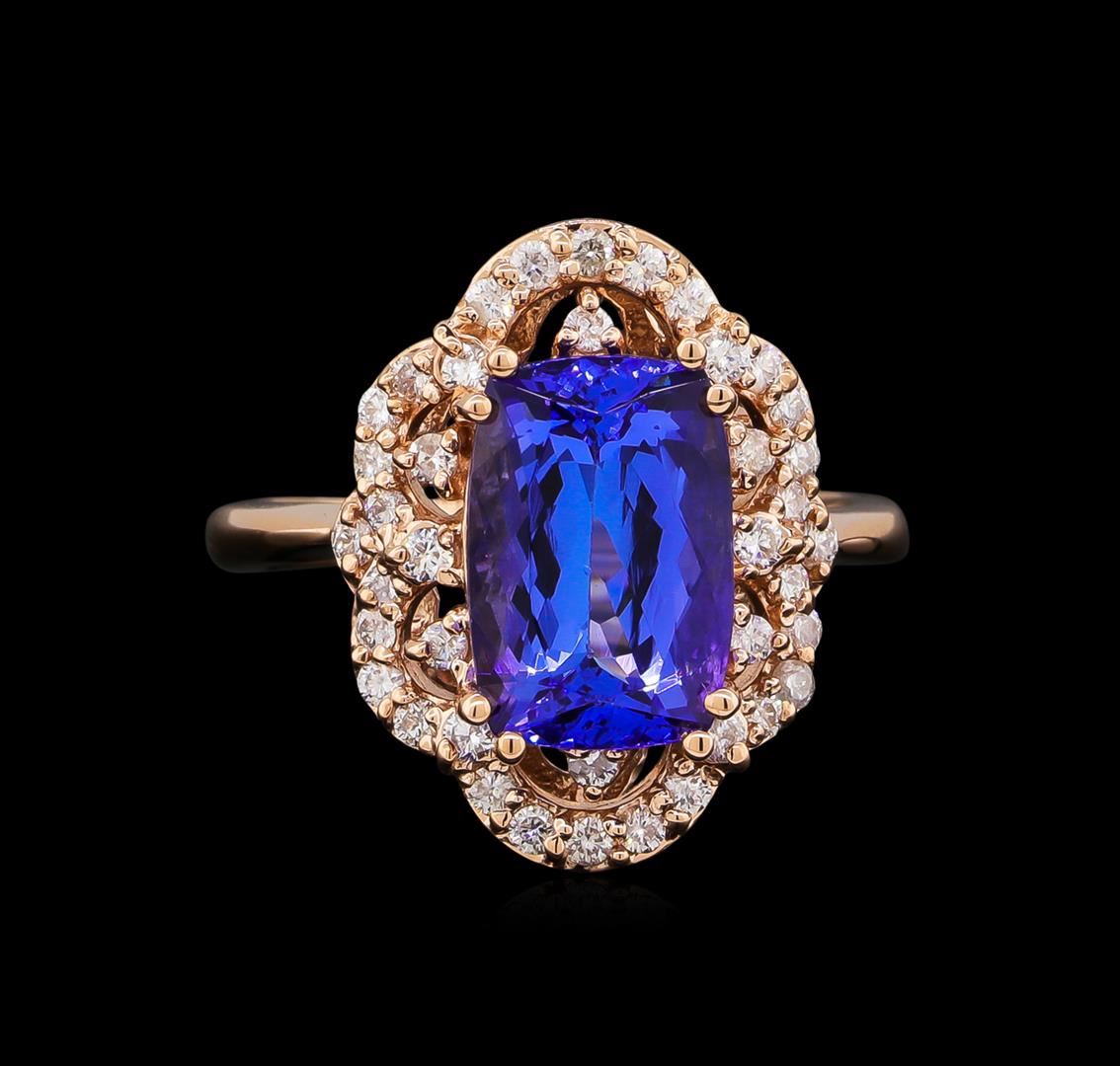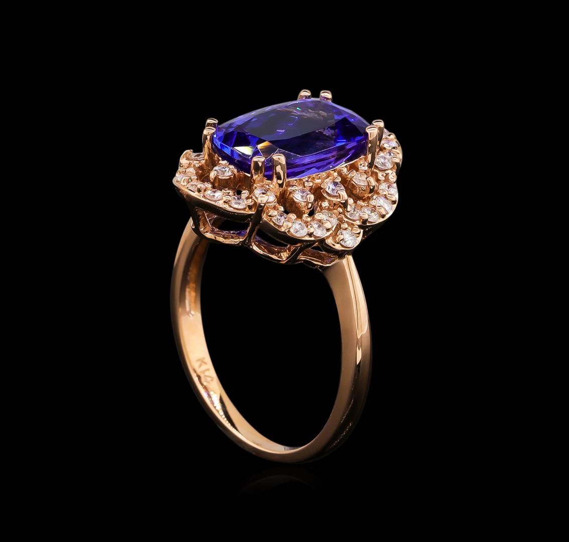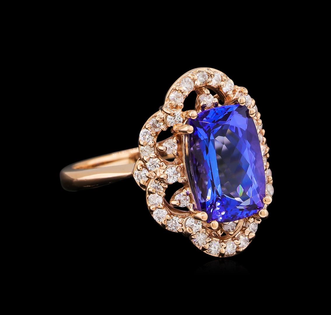 One electronically tested 14KT rose gold lady's cast fashion ring with a scalloped halo with a bright polish finish. The featured lady's ring has a shank measuring 1.90 millimeters wide. Identified with markings of "K14". Condition is new, good workmanship. Containing: One prong set rectangular cushion modified brilliant cut natural tanzanite, measuring 11.33 x 7.65 x 5.34mm, 5%. bulge factor, approximate weight of 3.83ct., clarity is eye clean, type I, medium dark, strong, violetish blue color, (GIA vB 6/5), cut is very good. Transmitting light with no distortion, transparent. Colored gemstones are presumed to have been subjected to commonly used enhancement processes. Graded in the setting. Forty-Four prong set round brilliant cut diamonds, measuring 1.60 - 1.40 x 0.90mm (depth est.) approximate total weight of 44 Stones = 0.55ct. Graded in the setting. Clarity: SI-1 to I-1. Color: G - I. Cut Good. Total Weight of Colored Stones 3.83ct. Total Weight of Diamonds 0.55ct. Total Weight of Ring 5.40gm. GAS Appraised at $8,890.00.