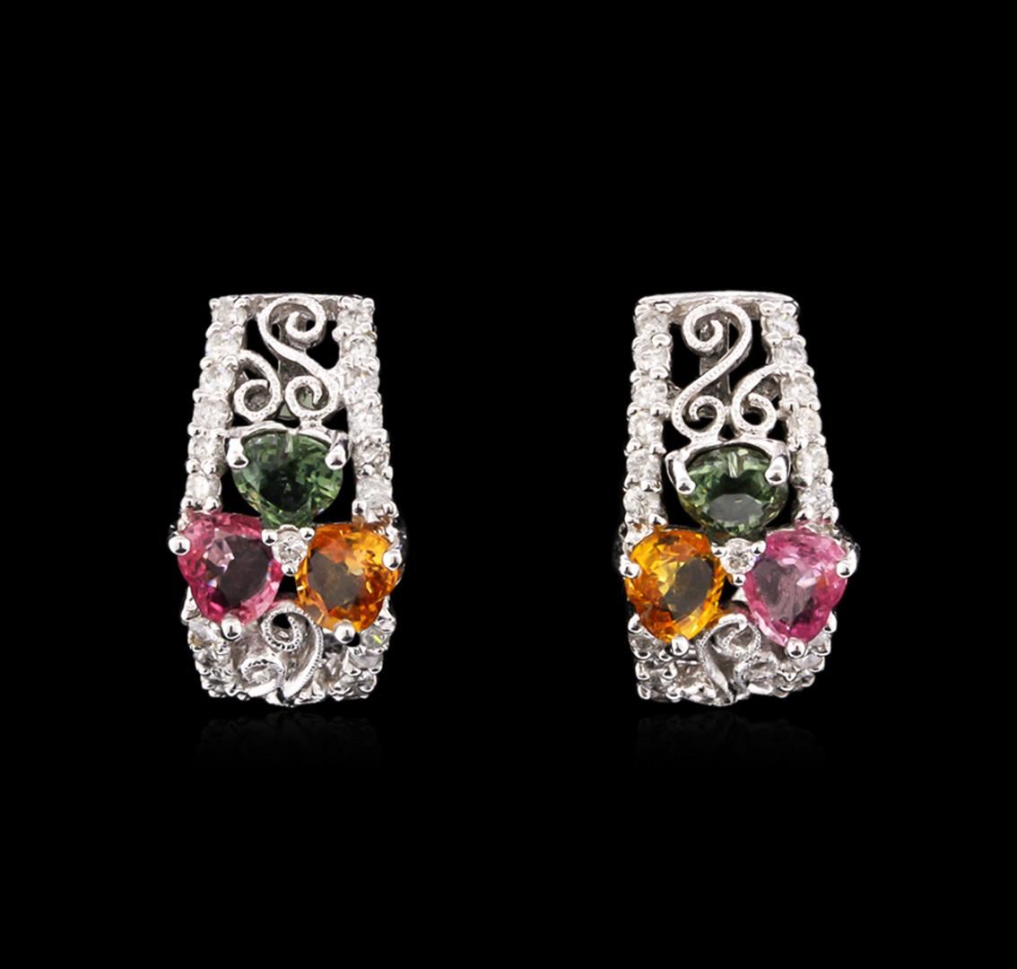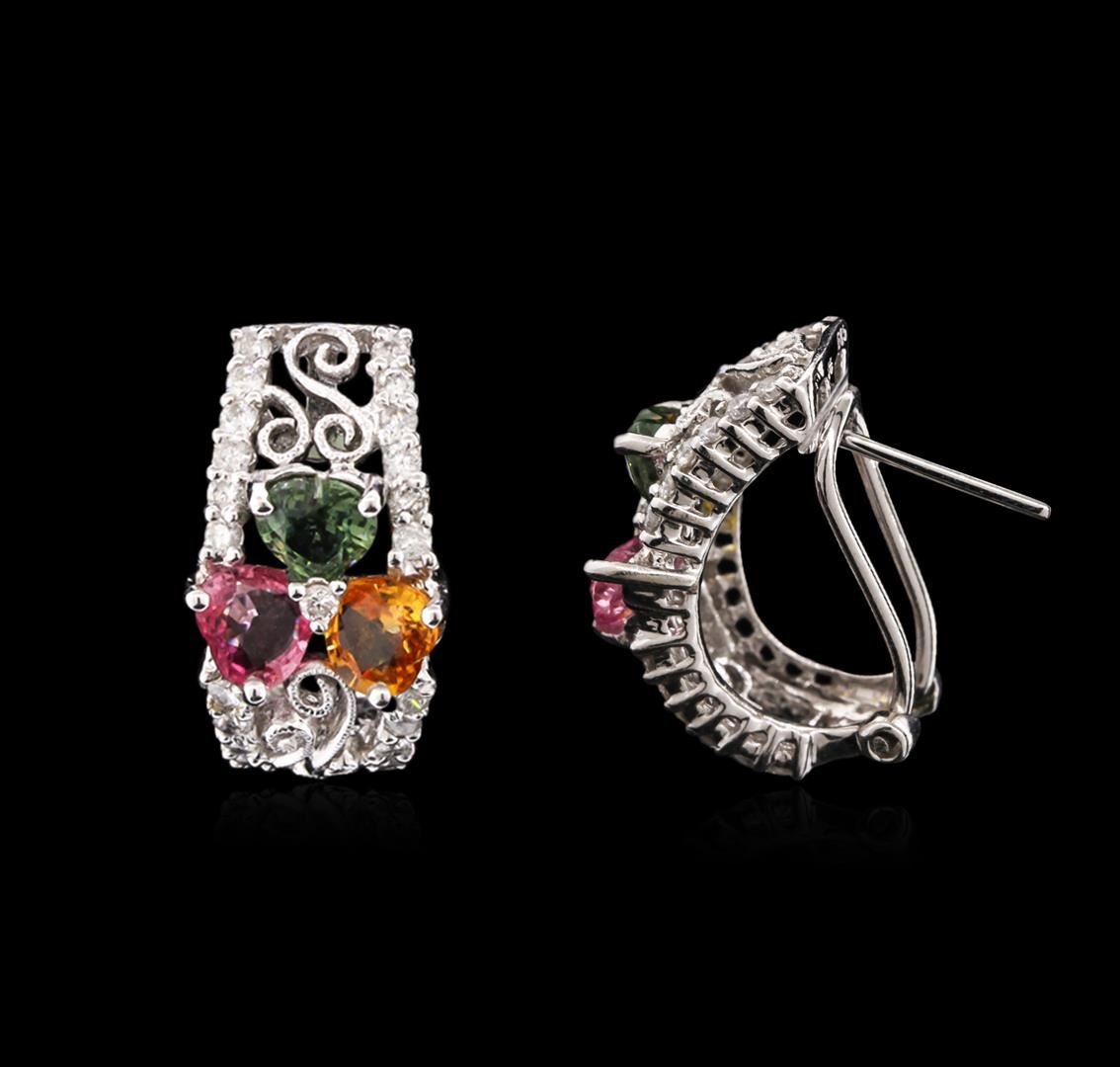 One pair of earrings featuring: 14KT white gold weighing 4.20 grams containing pink, green and orange sapphires with a total weight of 3.83ct and 50 brilliant cut diamonds with a total weight of 0.76ct.