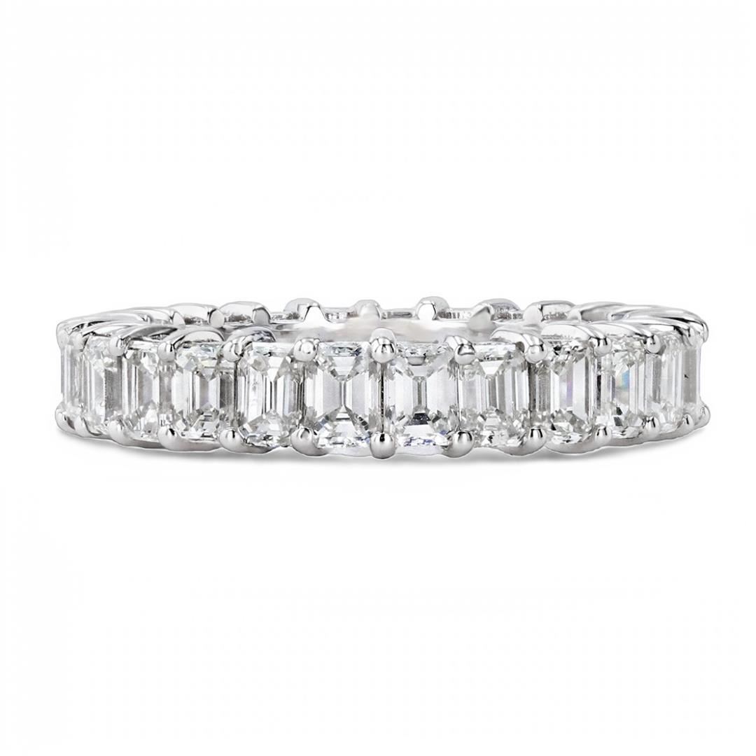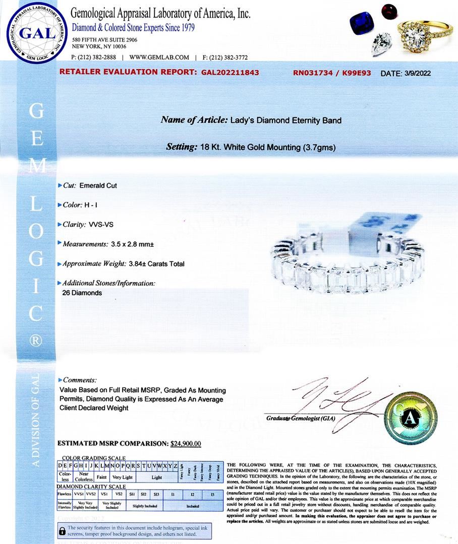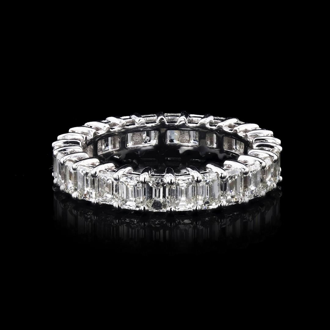 3.84ctw Diamond Eternity Band. Please see Photos and Description for all available information. This beautiful diamond eternity band in 18K white gold features 26 round cut diamonds with a total weight of 3.84ct. The shimmering Emerald Cut diamonds complement seamlessly with the white gold-tone; making it a romantic wedding band, especially when stacked with other ring styles. This ring is available in a size 6 3/4.