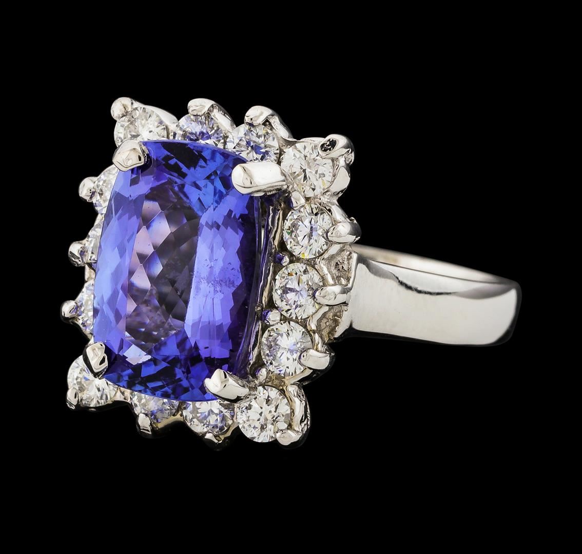 One electronically tested 14KT white gold lady's cast fashion ring with a cathedral shank with a basket halo with a bright polish finish. The featured lady's ring has a shank measuring 2.71 millimeters wide. Identified with markings of '14K'. Condition is new, good workmanship. Containing: One prong set rectangular cushion modified brilliant cut natural tanzanite, measuring 11.84 x 8.01 x 4.95mm, (depth est.) approximate weight of 3.84ct., clarity is eye clean, medium, moderately strong, violetish blue color, (GIA vB 5/4), cut is very good. Transmitting light with no distortion, transparent. Colored gemstones are presumed to have been subjected to commonly used enhancement processes. Graded in the setting. Fourteen prong set round brilliant cut diamonds, measuring 2.60 - 2.50 x 1.58mm (depth est.) approximate total weight of 14 Stones = 0.88ct. Graded in the setting. Clarity SI-1 to SI-2. Color: G - H Cut Good. Total Weight of Colored Stones 3.84ct.. Total Weight of Diamonds 0.88ct.. Total Weight of Ring 6.40gm. GAS Appraised at $9,170.00.
