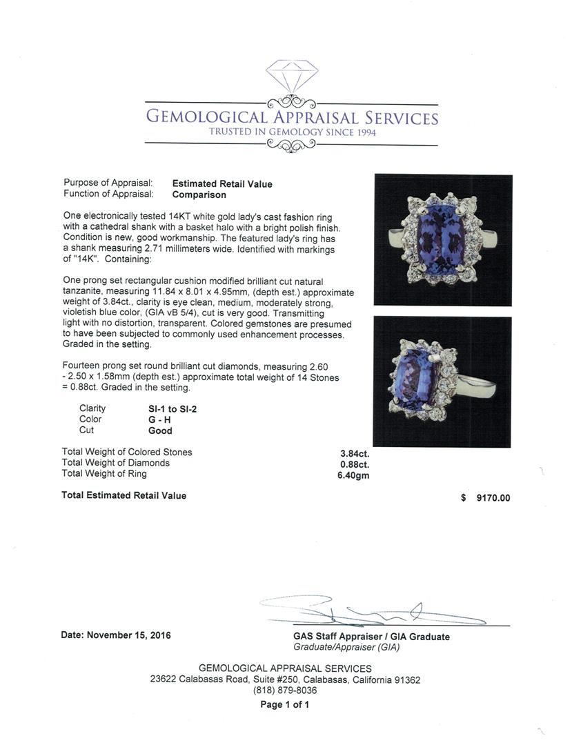 One electronically tested 14KT white gold lady's cast fashion ring with a cathedral shank with a basket halo with a bright polish finish. The featured lady's ring has a shank measuring 2.71 millimeters wide. Identified with markings of '14K'. Condition is new, good workmanship. Containing: One prong set rectangular cushion modified brilliant cut natural tanzanite, measuring 11.84 x 8.01 x 4.95mm, (depth est.) approximate weight of 3.84ct., clarity is eye clean, medium, moderately strong, violetish blue color, (GIA vB 5/4), cut is very good. Transmitting light with no distortion, transparent. Colored gemstones are presumed to have been subjected to commonly used enhancement processes. Graded in the setting. Fourteen prong set round brilliant cut diamonds, measuring 2.60 - 2.50 x 1.58mm (depth est.) approximate total weight of 14 Stones = 0.88ct. Graded in the setting. Clarity SI-1 to SI-2. Color: G - H Cut Good. Total Weight of Colored Stones 3.84ct.. Total Weight of Diamonds 0.88ct.. Total Weight of Ring 6.40gm. GAS Appraised at $9,170.00.