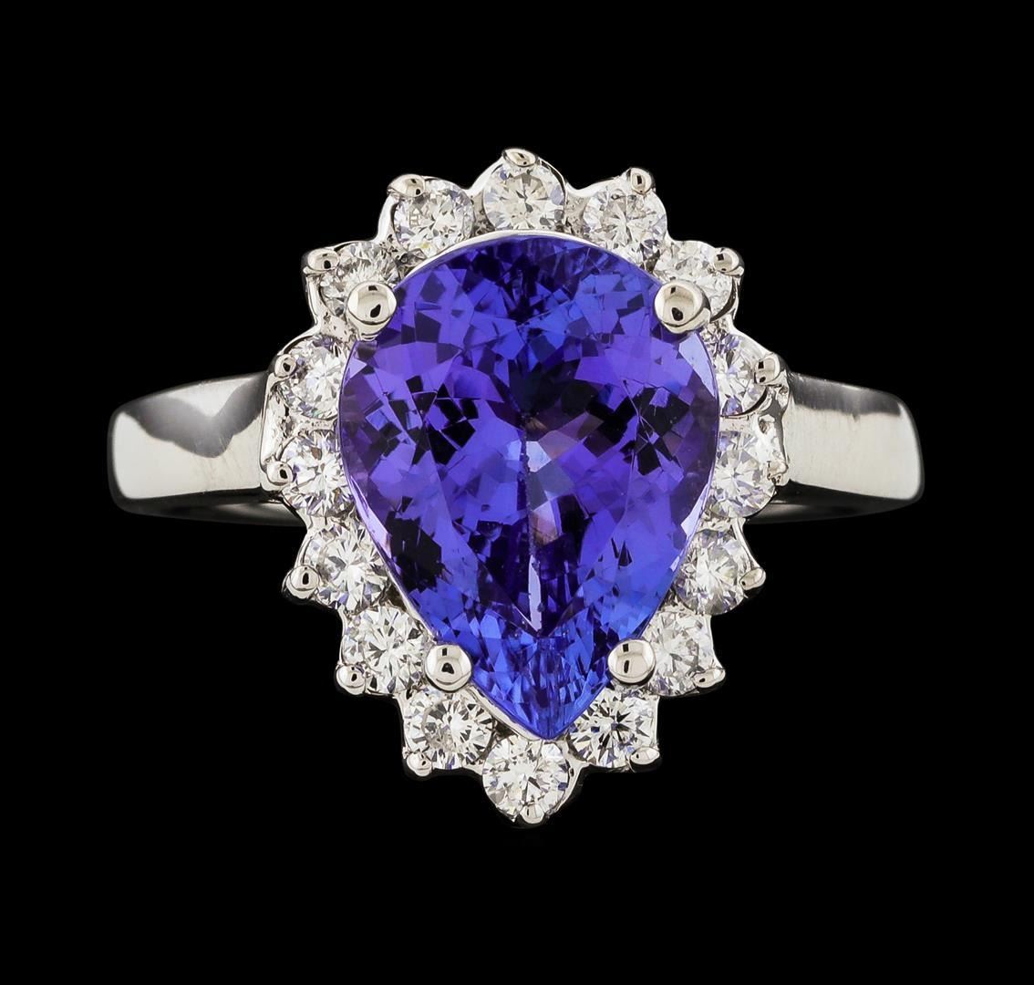 One electronically tested 14KT white gold lady's cast fashion ring with a basket halo with a bright polish finish. The featured lady's ring has a shank measuring 2.17 millimeters wide. Identified with markings of '14K'. Condition is new, good workmanship. Containing: One prong set pear modified brilliant cut natural tanzanite, measuring 11.94 x 9.02 x 5.71mm, (depth est.) approximate weight of 3.84ct., clarity is eye clean, medium, moderately strong, violetish blue color, (GIA vB 5/4), cut is good. Transmitting light with no distortion, transparent. Colored gemstones are presumed to have been subjected to commonly used enhancement processes. Graded in the setting. Sixteen prong set round brilliant cut diamonds, measuring 2.10 - 2.00 x 1.27mm (depth est.) approximate total weight of 16 Stones = 0.52ct. Graded in the setting. Clarity SI-1 to SI-2. Color: H - I Cut Good. Total Weight of Colored Stones 3.84ct.. Total Weight of Diamonds 0.52ct.. Total Weight of Ring 5.20gm GAS Appraised.