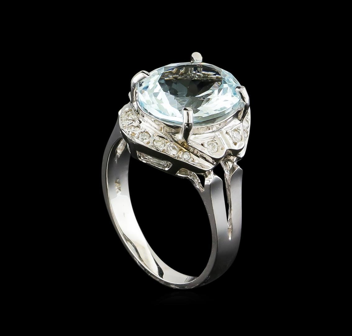 One Ring featuring: 14KT White Gold weighing 4.72 grams containing one Aquamarine center stone with a total weight of 3.85ct and Diamonds with a total weight of 0.19ct.