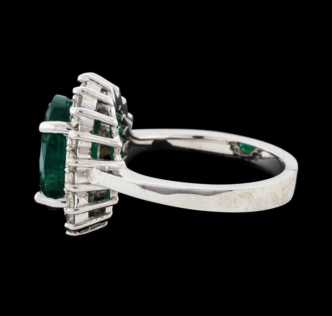 One electronically tested 14KT white gold lady's cast fashion ring with a basket halo with a bright polish finish. The featured lady's ring has a shank measuring 2.70 millimeters wide. Identified with markings of '14K'. Condition is new, good workmanship. Containing: One prong set oval modified mixed cut natural emerald, measuring 11.40 x 8.98 x 5.27mm, (depth est.) 15%. bulge factor, approximate weight of 3.85ct., clarity is heavily included, medium dark, moderately strong, green color, (GIA G 6/4), cut is good. Transmitting light somewhat diffusely, semi-transparent to translucent. Indications of oil residue. Naturally occurring internal & external characteristics are present. Colored gemstones are presumed to have been subjected to commonly used enhancement processes. Graded in the setting. Eighteen prong set round brilliant cut diamonds, measuring 2.00 - 1.95 x 1.23mm (depth est.) approximate total weight of 18 Stones = 0.55ct. Graded in the setting. Clarity SI-1 to SI-2. Color: H - I Cut Good. Total Weight of Colored Stones 3.85ct.. Total Weight of Diamonds 0.55ct.. Total Weight of Ring 6.40gm. GAS Appraised at $5,840.00.
