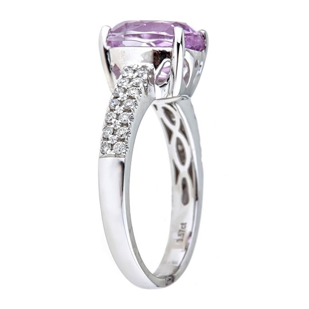 One Kunzite and Diamond Ring featuring: 14KT White Gold with a total weight of 3.83 grams, Kunzite with a total weight of 3.85ct, and 28 Round Cut Diamonds with a total weight of 0.27ctw.
