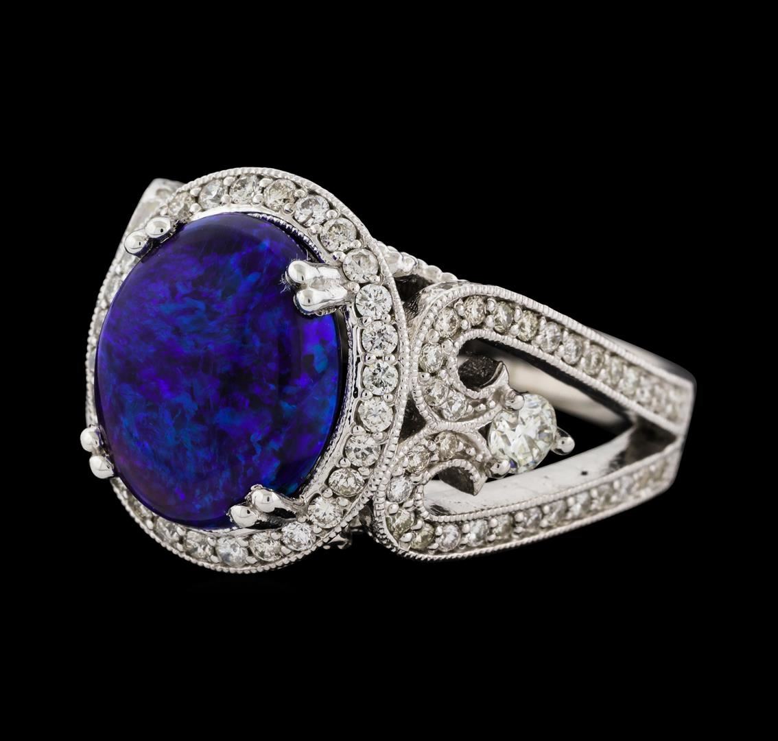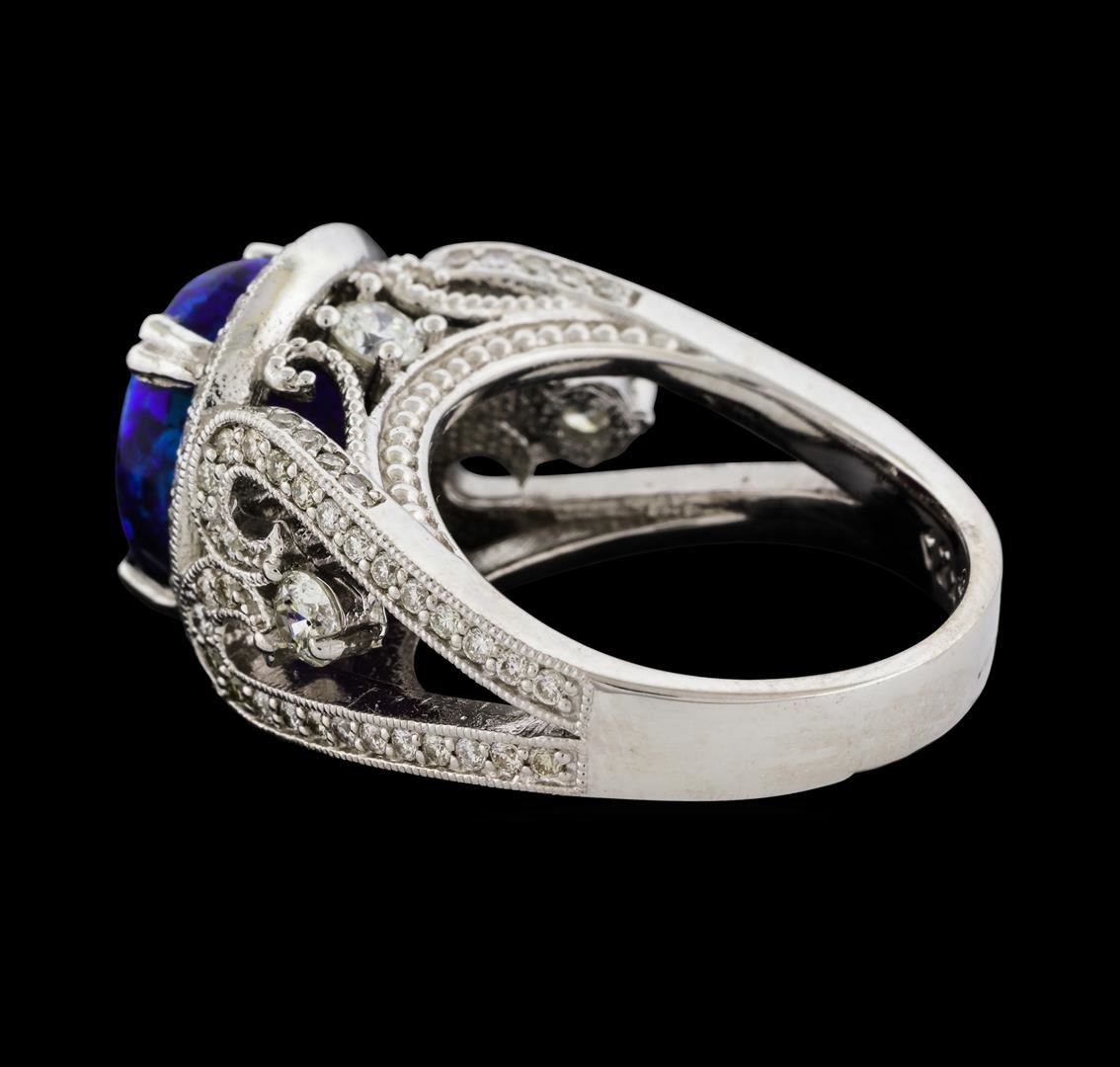 One electronically tested 14KT white gold lady's cast fashion ring with a cathedral split shank with a bright polish with milgrain detailing finish. The featured lady's ring has a shank measuring 3.50 millimeters wide. Identified with markings of '14K'. Condition is new, good workmanship. Containing: One black opal that is cut in a oval shaped cabochon and is prong set, measuring 11.85 mm long x 9.87 mm wide, and 5.45 mm thick and the approximate weight is 3.85 carats. The opal has a quite bright, green-blue play of color (fire) in a rolling flashfire pattern; a medium dome; a good cut; no inclusions; consistent in its brightness and pattern; and is not directional. Four prong set round brilliant cut diamonds, measuring 3.20 - 3.10 x 1.95mm (depth est.) approximate total weight of 4 Stones = 0.50ct. Graded in the setting. Clarity SI-1 to SI-2. Color: H - I Cut Good One Hundred Eight prong set round brilliant cut diamonds, measuring 1.30 - 1.15 x 0.76mm (depth est.) approximate total weight of 108 Stones = 0.75ct. Graded in the setting. Clarity SI-1 to SI-2. Color: H - J Cut Good. Total Weight of Diamonds 1.25ct.. Total Weight of Opals 3.85ct.. Total Weight of Ring 9.90gm. GAS Appraised at $9,925.00.