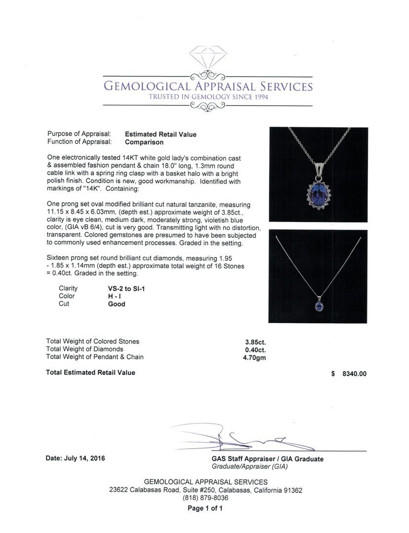 One electronically tested 14KT white gold lady's combination cast & assembled fashion pendant & chain 18.0' long, 1.3mm round cable link with a spring ring clasp with a basket halo with a bright polish finish. Identified with markings of '14K'. Condition is new, good workmanship. Containing: One prong set oval modified brilliant cut natural tanzanite, measuring 11.15 x 8.45 x 6.03mm, (depth est.) approximate weight of 3.85ct., clarity is eye clean, medium dark, moderately strong, violetish blue color, (GIA vB 6/4), cut is very good. Transmitting light with no distortion, transparent. Colored gemstones are presumed to have been subjected to commonly used enhancement processes. Graded in the setting. Sixteen prong set round brilliant cut diamonds, measuring 1.95 - 1.85 x 1.14mm (depth est.) approximate total weight of 16 Stones = 0.40ct. Graded in the setting. Clarity VS-2 to SI-1. Color: H - I Cut Good. Total Weight of Colored Stones 3.85ct.. Total Weight of Diamonds 0.40ct.. Total Weight of Pendant & Chain 4.70gm. GAS Appraised at $8,340.00.