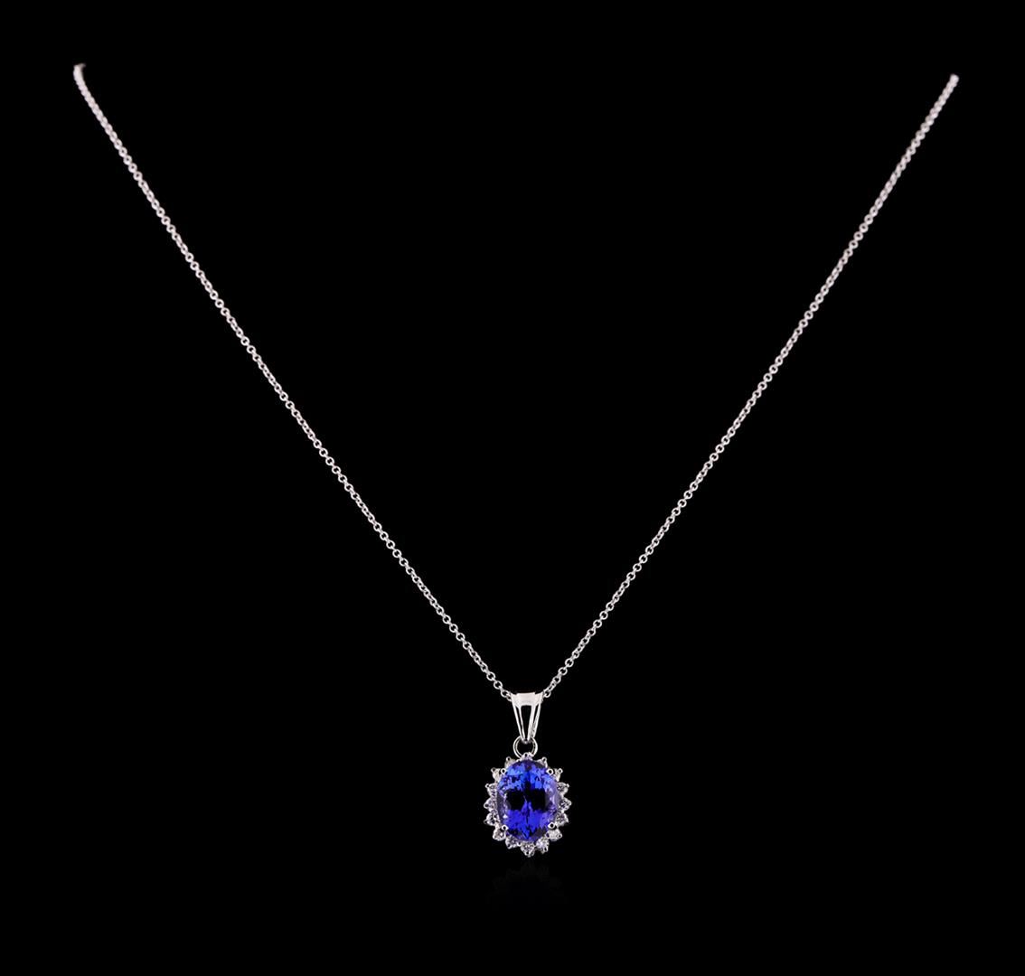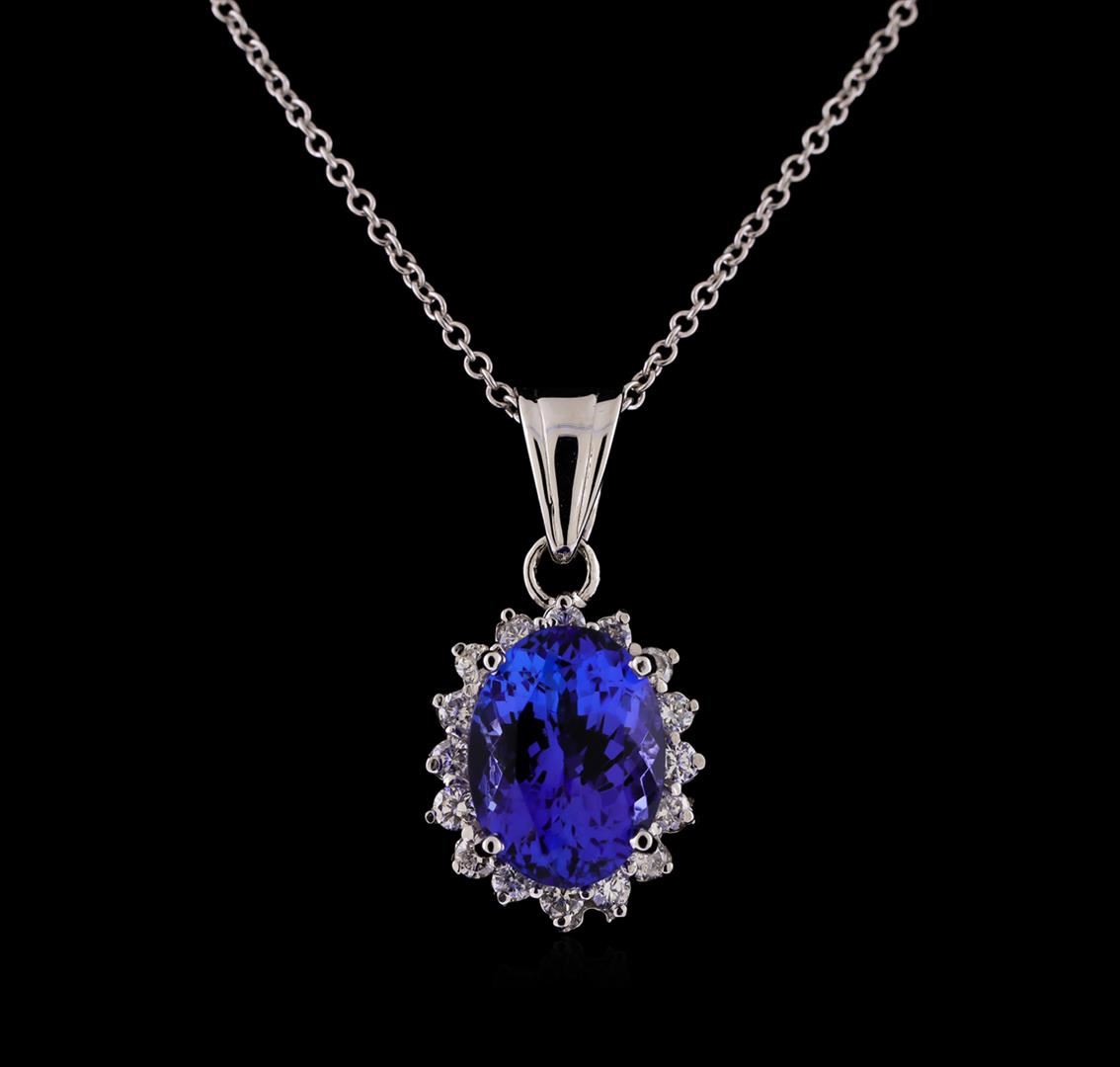 One electronically tested 14KT white gold lady's combination cast & assembled fashion pendant & chain 18.0' long, 1.3mm round cable link with a spring ring clasp with a basket halo with a bright polish finish. Identified with markings of '14K'. Condition is new, good workmanship. Containing: One prong set oval modified brilliant cut natural tanzanite, measuring 11.15 x 8.45 x 6.03mm, (depth est.) approximate weight of 3.85ct., clarity is eye clean, medium dark, moderately strong, violetish blue color, (GIA vB 6/4), cut is very good. Transmitting light with no distortion, transparent. Colored gemstones are presumed to have been subjected to commonly used enhancement processes. Graded in the setting. Sixteen prong set round brilliant cut diamonds, measuring 1.95 - 1.85 x 1.14mm (depth est.) approximate total weight of 16 Stones = 0.40ct. Graded in the setting. Clarity VS-2 to SI-1. Color: H - I Cut Good. Total Weight of Colored Stones 3.85ct.. Total Weight of Diamonds 0.40ct.. Total Weight of Pendant & Chain 4.70gm. GAS Appraised at $8,340.00.