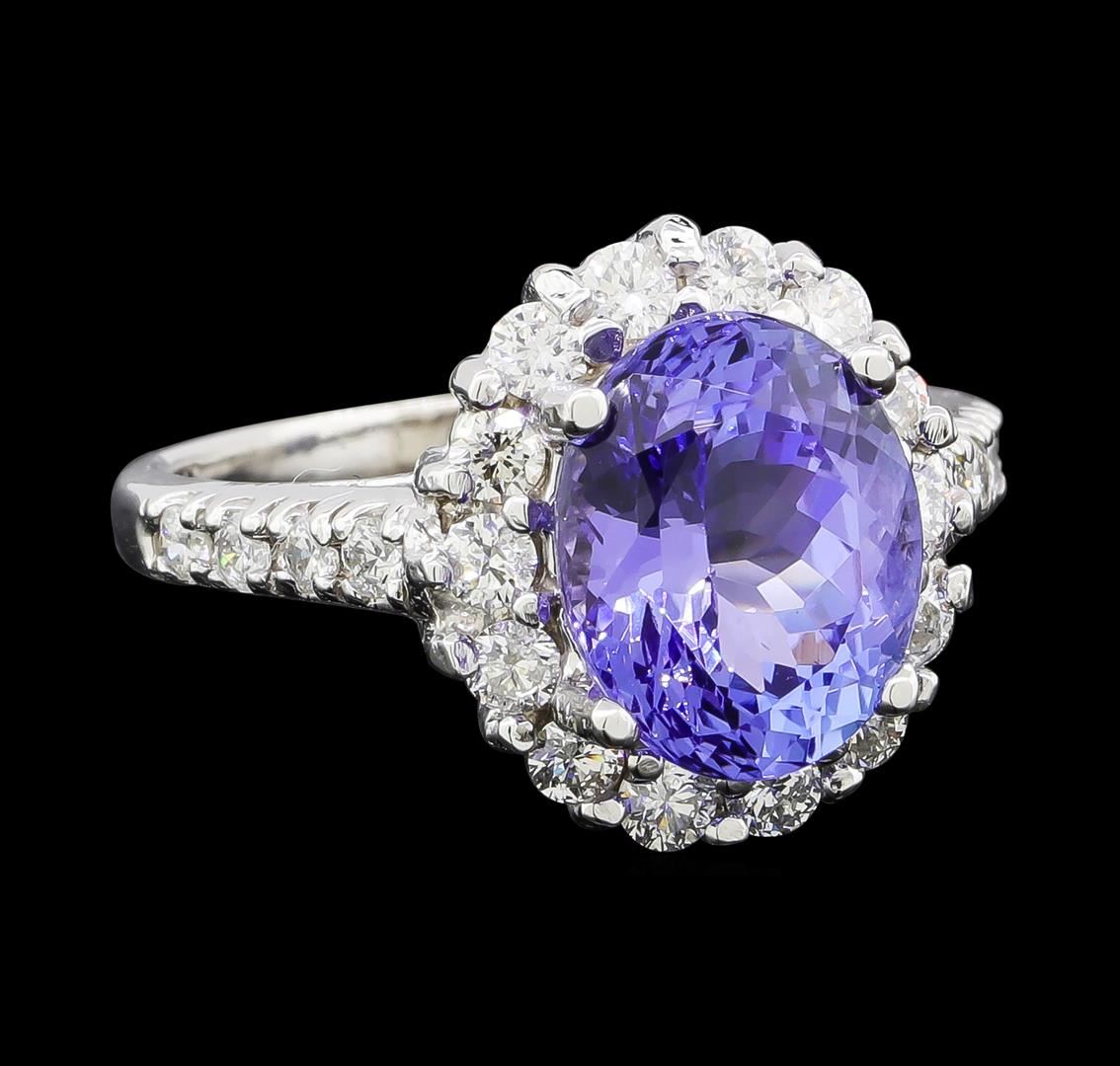 One electronically tested 14KT white gold lady's cast fashion ring with a basket halo with a bright polish finish. The featured lady's ring has a shank measuring 2.06 millimeters wide. Identified with markings of '14K'. Condition is new, good workmanship. Containing: One prong set oval modified brilliant cut natural tanzanite, measuring 10.62 x 8.57 x 6.11mm, (depth est.) approximate weight of 3.85ct., clarity is eye clean, medium, moderately strong, bluish violet color, (GIA bV 5/4), cut is very good. Transmitting light with no distortion, transparent. Colored gemstones are presumed to have been subjected to commonly used enhancement processes. Graded in the setting. Fourteen prong set round brilliant cut diamonds, measuring 2.30 - 2.20 x 1.35mm (depth est.) approximate total weight of 14 Stones = 0.58ct. Graded in the setting. Clarity SI-1 to I-1. Color: G - H Cut Good Eight prong set round brilliant cut diamonds, measuring 1.90 - 1.85 x 1.17mm (depth est.) approximate total weight of 8 Stones = 0.20ct. Graded in the setting. Clarity SI-1 to I-1. Color: G - H Cut Good. Total Weight of Colored Stones 3.85ct.. Total Weight of Diamonds 0.78ct.. Total Weight of Ring 5.50gm. GAS Appraised at $8,575.00.