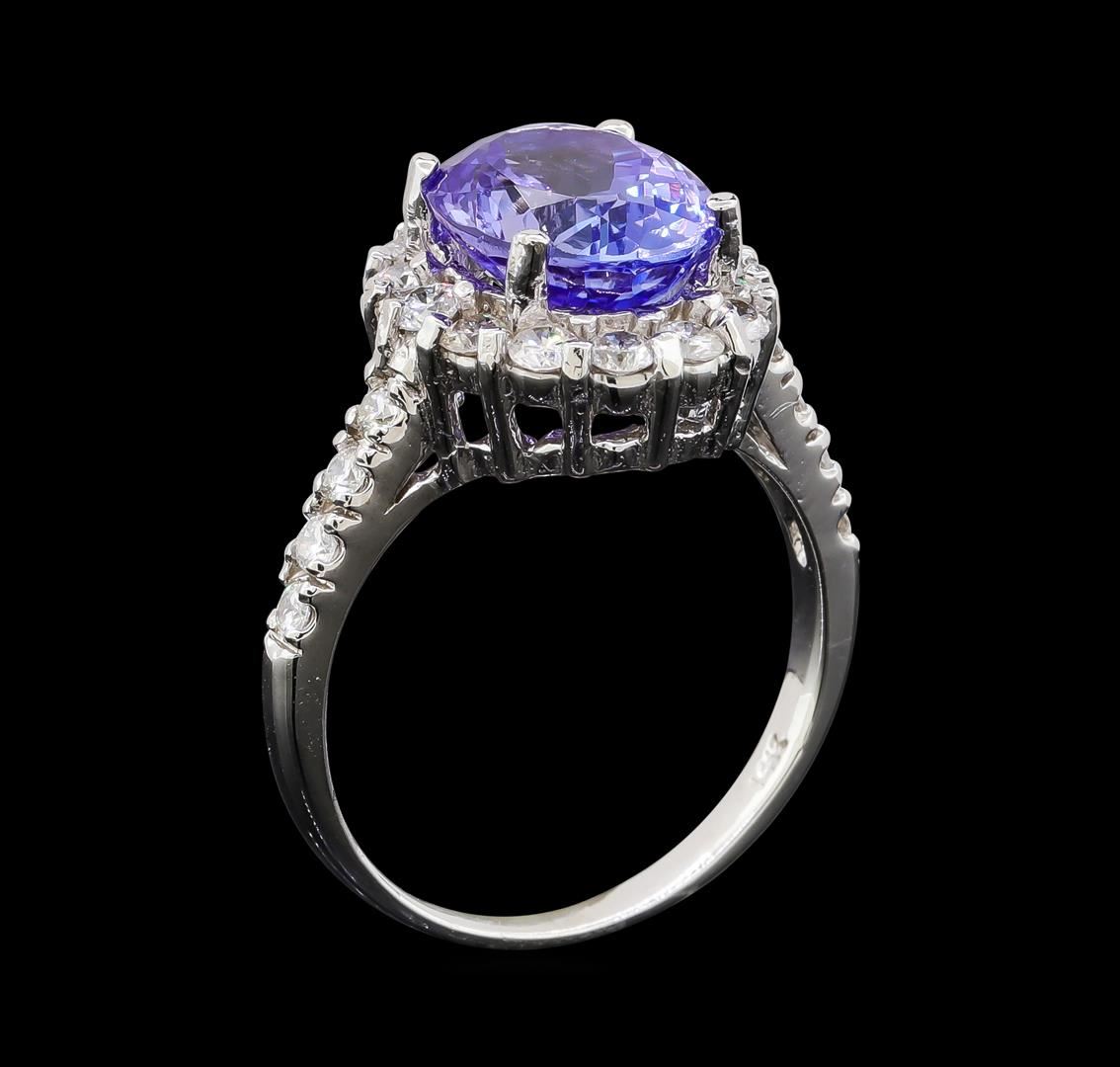 One electronically tested 14KT white gold lady's cast fashion ring with a basket halo with a bright polish finish. The featured lady's ring has a shank measuring 2.06 millimeters wide. Identified with markings of '14K'. Condition is new, good workmanship. Containing: One prong set oval modified brilliant cut natural tanzanite, measuring 10.62 x 8.57 x 6.11mm, (depth est.) approximate weight of 3.85ct., clarity is eye clean, medium, moderately strong, bluish violet color, (GIA bV 5/4), cut is very good. Transmitting light with no distortion, transparent. Colored gemstones are presumed to have been subjected to commonly used enhancement processes. Graded in the setting. Fourteen prong set round brilliant cut diamonds, measuring 2.30 - 2.20 x 1.35mm (depth est.) approximate total weight of 14 Stones = 0.58ct. Graded in the setting. Clarity SI-1 to I-1. Color: G - H Cut Good Eight prong set round brilliant cut diamonds, measuring 1.90 - 1.85 x 1.17mm (depth est.) approximate total weight of 8 Stones = 0.20ct. Graded in the setting. Clarity SI-1 to I-1. Color: G - H Cut Good. Total Weight of Colored Stones 3.85ct.. Total Weight of Diamonds 0.78ct.. Total Weight of Ring 5.50gm. GAS Appraised at $8,575.00.