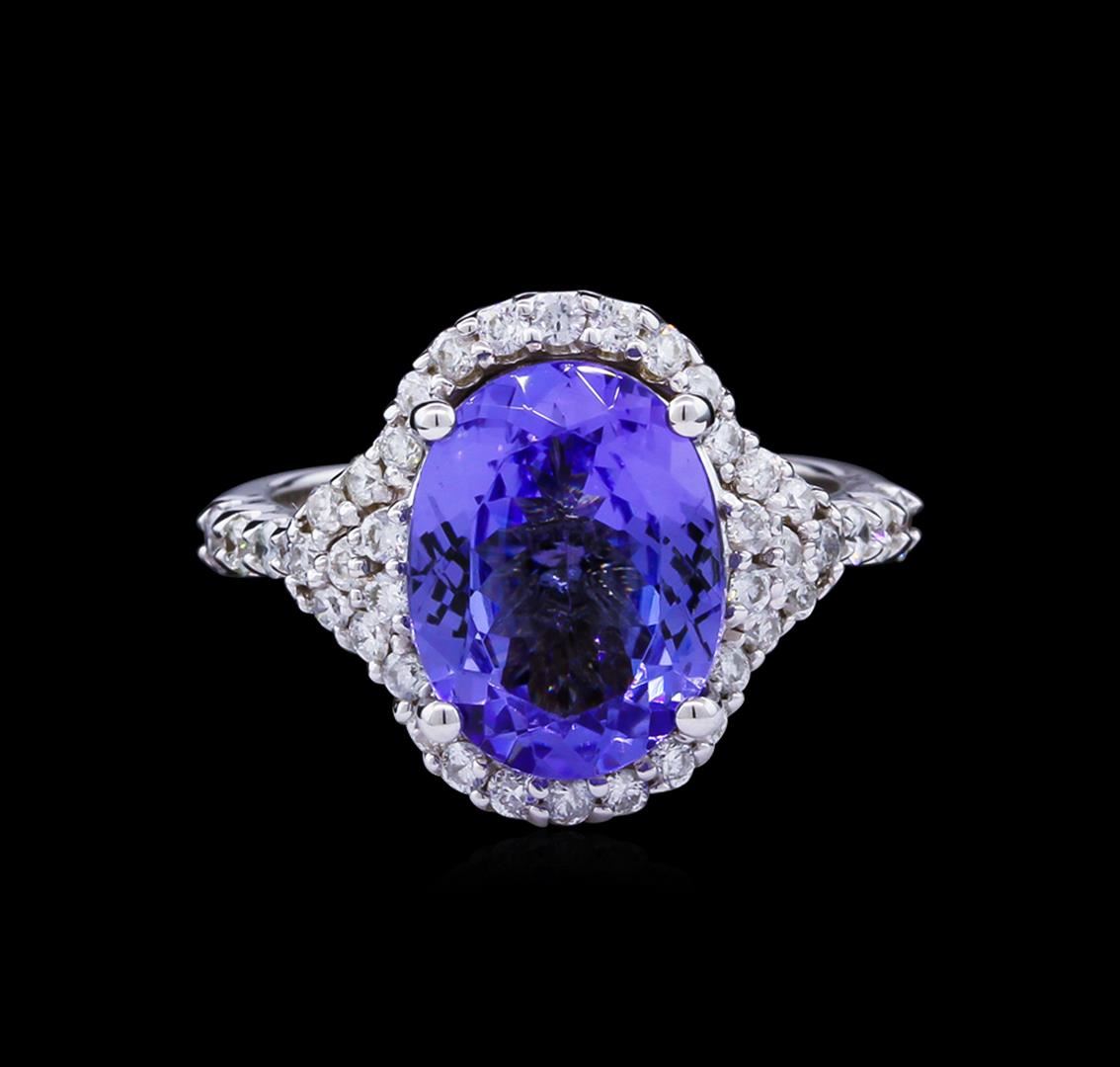 One electronically tested 14KT white gold lady's combination cast & assembled fashion ring with a halo with a bright polish finish. The featured lady's ring has a shank measuring 3.11 millimeters wide. Identified with markings of "K14". Condition is new, good workmanship. Containing: One prong set oval modified brilliant cut natural tanzanite, measuring 11.90 x 9.02 x 5.20mm, approximate weight of 3.85ct., clarity is eye clean, type I, medium light, very slightly grayish, bluish violet color, (GIA bV 4/3), cut is very good. Transmitting light with no distortion, transparent. Colored gemstones are presumed to have been subjected to commonly used enhancement processes. Graded in the setting. Thirty-Six prong set round brilliant cut diamonds, measuring 1.55 - 1.45 x 0.95mm (depth est.) approximate total weight of 36 Stones = 0.48ct. Graded in the setting. Clarity: SI-2 to I-1. Color: H - I. Cut Good Six prong set round brilliant cut diamonds, measuring 2.10 - 1.75 x 1.22mm (depth est.) approximate total weight of 6 Stones = 0.18ct. Graded in the setting. Clarity: SI-1 to SI-2. Color: H - I. Cut Good. Total Weight of Colored Stones 3.85ct. Total Weight of Diamonds 0.66ct. Total Weight of Ring 6.00gm. GAS Appraised at $6,495.00.