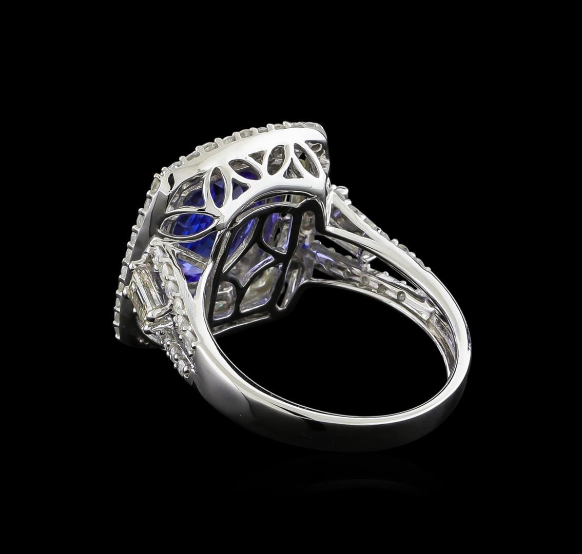 One electronically tested 14KT white gold ladies cast tanzanite and diamond ring with a bright polish finish. The featured tanzanite is set within tiered diamond bezels supported by diamond set split shoulders, completed by a two and one-half millimeter wide band. Trademark is Orianne. Identified with markings of "14K". Condition is new, good workmanship. Containing: One prong set oval mixed cut natural tanzanite, measuring 10.93 x 8.90 x 5.32mm, 6%. bulge factor, approximate weight of 3.86ct., clarity is eye clean, type I, medium dark, very slightly grayish, bluish violet color, (GIA bV 6/3), cut is good. Transmitting light with no distortion, transparent. Graded in the setting. Tanzanite is a very rare gemstone that is only found in the country of Tanzania. Originally discovered in 1967. Tiffany & Company, named the stone Tanzanite. It is found in the Usumburu Mountains that border the Umba Valley of northern Tanzania. Tanzanite occurs in gray, brown, violet, blue, reddish-purple, & green. The gem is interesting because of its exceptional pleochroism. Rotated in different directions a tanzanite will exhibit multiple changes of color. Tanzanite has a low tolerance to ultrasonic cleaning, and should not be cleaned using this method. Eighty-Eight prong & channel set round brilliant cut diamonds, measuring 1.90 - 1.40 x 0.99mm (depth est.) approximate total weight of 88 Stones = 1.44ct. Graded in the setting. Clarity: I-2 to I-3. Color: H - J Two prong set baguette cut diamonds, measuring from 4.20 x 2.10 x 1.47mm (depth est.) to 4.30 x 2.15 x 1.51mm (depth est.) approximate total weight of 2 Stones = 0.24ct. Graded in the setting. Clarity: VS-1. Color: H - I. Total Weight of Colored Stones 3.86ct. Total Weight of Diamonds 1.68ct. Total Weight of Ring 6.13gm AIG Appraised at $12,810.00.