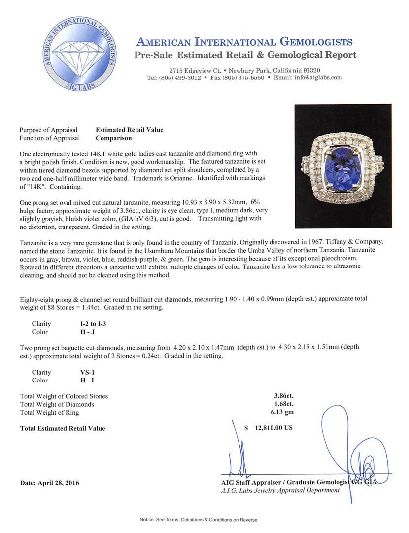 One electronically tested 14KT white gold ladies cast tanzanite and diamond ring with a bright polish finish. The featured tanzanite is set within tiered diamond bezels supported by diamond set split shoulders, completed by a two and one-half millimeter wide band. Trademark is Orianne. Identified with markings of "14K". Condition is new, good workmanship. Containing: One prong set oval mixed cut natural tanzanite, measuring 10.93 x 8.90 x 5.32mm, 6%. bulge factor, approximate weight of 3.86ct., clarity is eye clean, type I, medium dark, very slightly grayish, bluish violet color, (GIA bV 6/3), cut is good. Transmitting light with no distortion, transparent. Graded in the setting. Tanzanite is a very rare gemstone that is only found in the country of Tanzania. Originally discovered in 1967. Tiffany & Company, named the stone Tanzanite. It is found in the Usumburu Mountains that border the Umba Valley of northern Tanzania. Tanzanite occurs in gray, brown, violet, blue, reddish-purple, & green. The gem is interesting because of its exceptional pleochroism. Rotated in different directions a tanzanite will exhibit multiple changes of color. Tanzanite has a low tolerance to ultrasonic cleaning, and should not be cleaned using this method. Eighty-Eight prong & channel set round brilliant cut diamonds, measuring 1.90 - 1.40 x 0.99mm (depth est.) approximate total weight of 88 Stones = 1.44ct. Graded in the setting. Clarity: I-2 to I-3. Color: H - J Two prong set baguette cut diamonds, measuring from 4.20 x 2.10 x 1.47mm (depth est.) to 4.30 x 2.15 x 1.51mm (depth est.) approximate total weight of 2 Stones = 0.24ct. Graded in the setting. Clarity: VS-1. Color: H - I. Total Weight of Colored Stones 3.86ct. Total Weight of Diamonds 1.68ct. Total Weight of Ring 6.13gm AIG Appraised at $12,810.00.