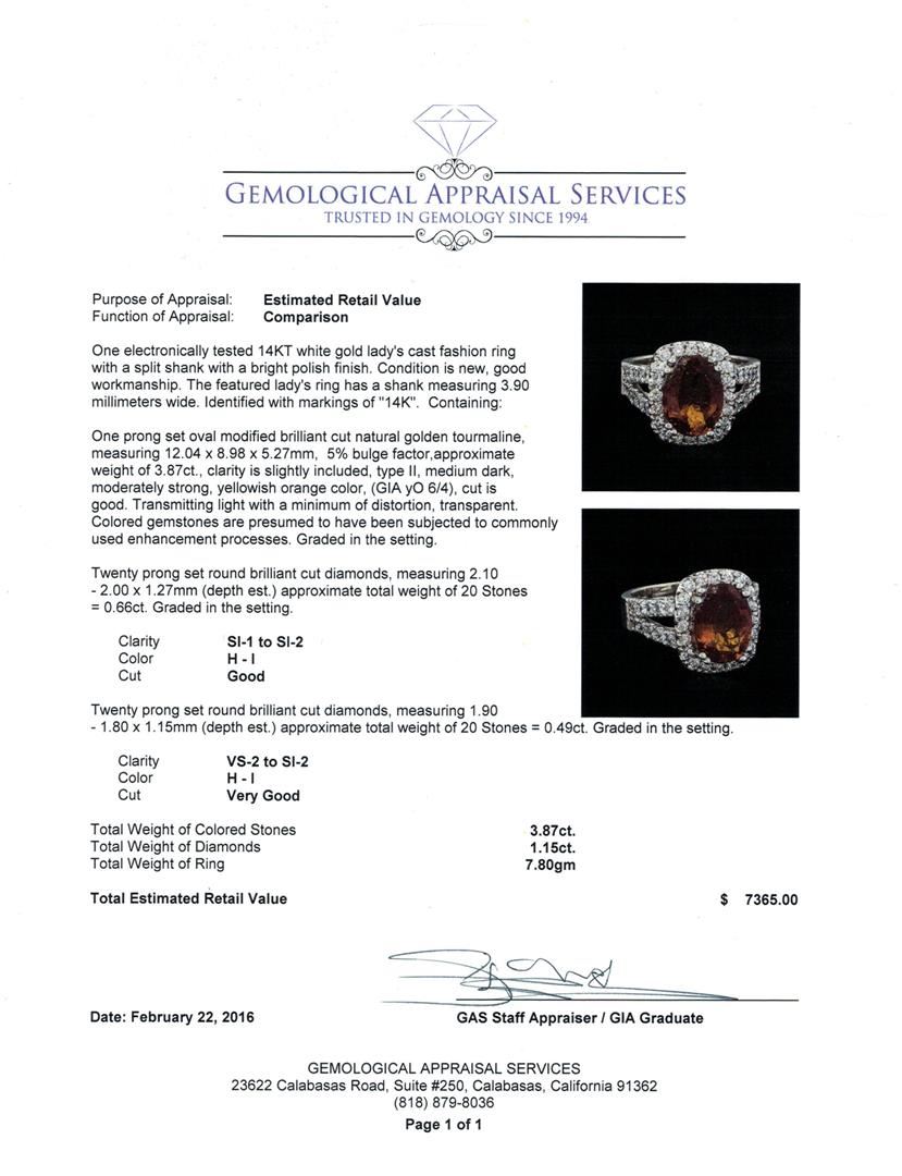 One electronically tested 14KT white gold lady's cast fashion ring with a split shank with a bright polish finish. The featured lady's ring has a shank measuring 3.90 millimeters wide. Identified with markings of "14K". Condition is new, good workmanship. Containing: One prong set oval modified brilliant cut natural golden tourmaline, measuring 12.04 x 8.98 x 5.27mm, 5%. bulge factor, approximate weight of 3.87ct., clarity is slightly included, type II, medium dark, moderately strong, yellowish orange color, (GIA yO 6/4), cut is good. Transmitting light with a minimum of distortion, transparent. Colored gemstones are presumed to have been subjected to commonly used enhancement processes. Graded in the setting. Twenty prong set round brilliant cut diamonds, measuring 2.10 - 2.00 x 1.27mm (depth est.) approximate total weight of 20 Stones = 0.66ct. Graded in the setting. Clarity: SI-1 to SI-2. Color: H - I. Cut Good Twenty prong set round brilliant cut diamonds, measuring 1.90 - 1.80 x 1.15mm (depth est.) approximate total weight of 20 Stones = 0.49ct. Graded in the setting. Clarity: VS-2 to SI-2. Color: H - I. Cut Very Good. Total Weight of Colored Stones 3.87ct. Total Weight of Diamonds 1.15ct. Total Weight of Ring 7.80gm. GAS Appraised at $7,365.00.