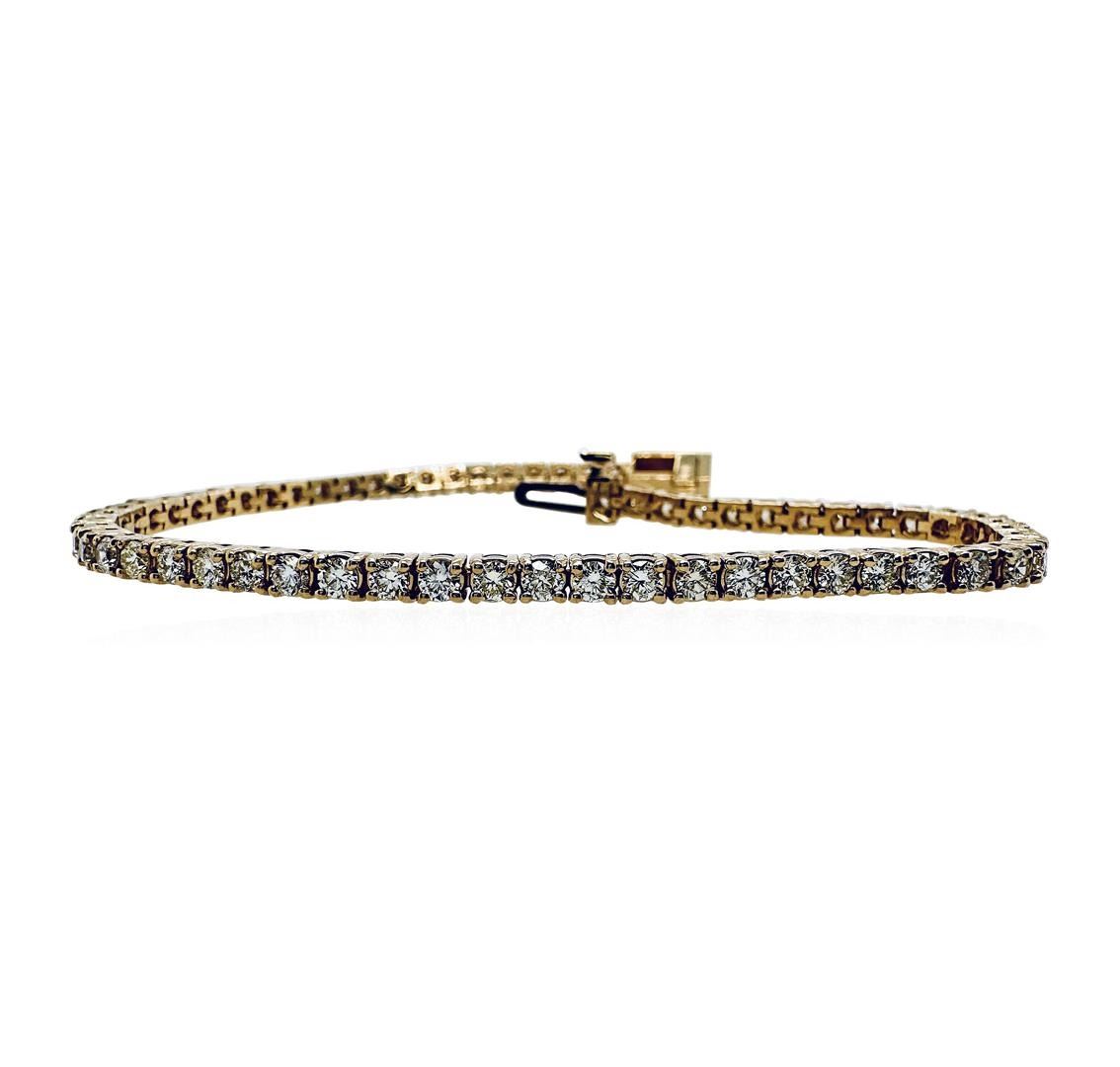One electronically tested 14KT white gold lady's combination cast & assembled fashion straight line tennis bracelet with a tongue clasp with fold-under safety with a basket motif with a bright polish finish. Condition is new, good workmanship. The featured lady's bracelet measures approximately 7.00 inches in length. Identified with markings of 14K. Containing: 64 prong set round brilliant cut diamonds, approximate total weight of 64 stones = 3.88 ctw. Graded in the setting. Total weight of Diamonds: 3.88 ctw. Total estimated retail value: $9995