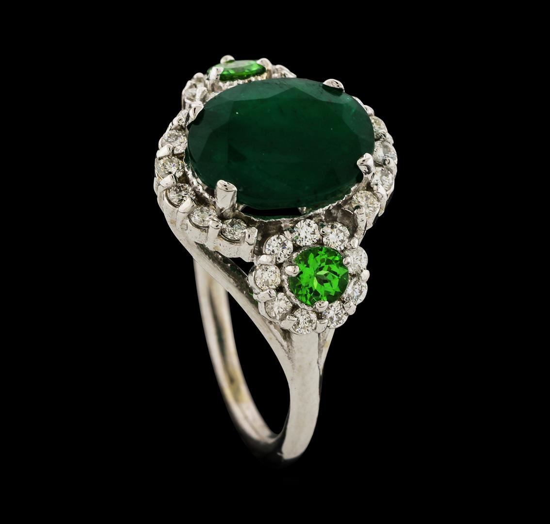 One electronically tested 14KT white gold lady's cast fashion ring with a three stone halo with a bright polish finish. The featured lady's ring has a shank measuring 1.89 millimeters wide. Identified with markings of '14K'. Condition is new, good workmanship. Containing: One prong set oval modified mixed cut natural emerald, measuring 11.32 x 8.96 x 5.18mm, (depth est.) 10%. bulge factor, approximate weight of 3.46ct., clarity is heavily included, medium dark, moderately strong, green color, (GIA G 6/4), cut is good. Transmitting light somewhat diffusely, semi-transparent to translucent. No indications of clarity enhancement. Indications of oil residue. Colored gemstones are presumed to have been subjected to commonly used enhancement processes. Graded in the setting. Two prong set round modified brilliant cut natural tsavorite garnets, measuring 3.60 - 3.50 x 2.31 mm, (depth est.) approximate total weight of 0.42ct., clarity is eye clean, medium, moderately strong, slightly yellowish green color, (GIA slyG 5/4), cut is good. Transmitting light with no distortion, transparent. Colored gemstones are presumed to have been subjected to commonly used enhancement processes. Graded in the setting. Thirty prong set round brilliant cut diamonds, measuring 1.70 - 1.60 x 1.02mm (depth est.) approximate total weight of 30 Stones = 0.52ct. Graded in the setting. Clarity SI-1 to SI-2. Color: G - H Cut Good. Total Weight of Colored Stones 3.88ct.. Total Weight of Diamonds 0.52ct.. Total Weight of Ring 6.40gm. GAS Appraised at $6,135.00.