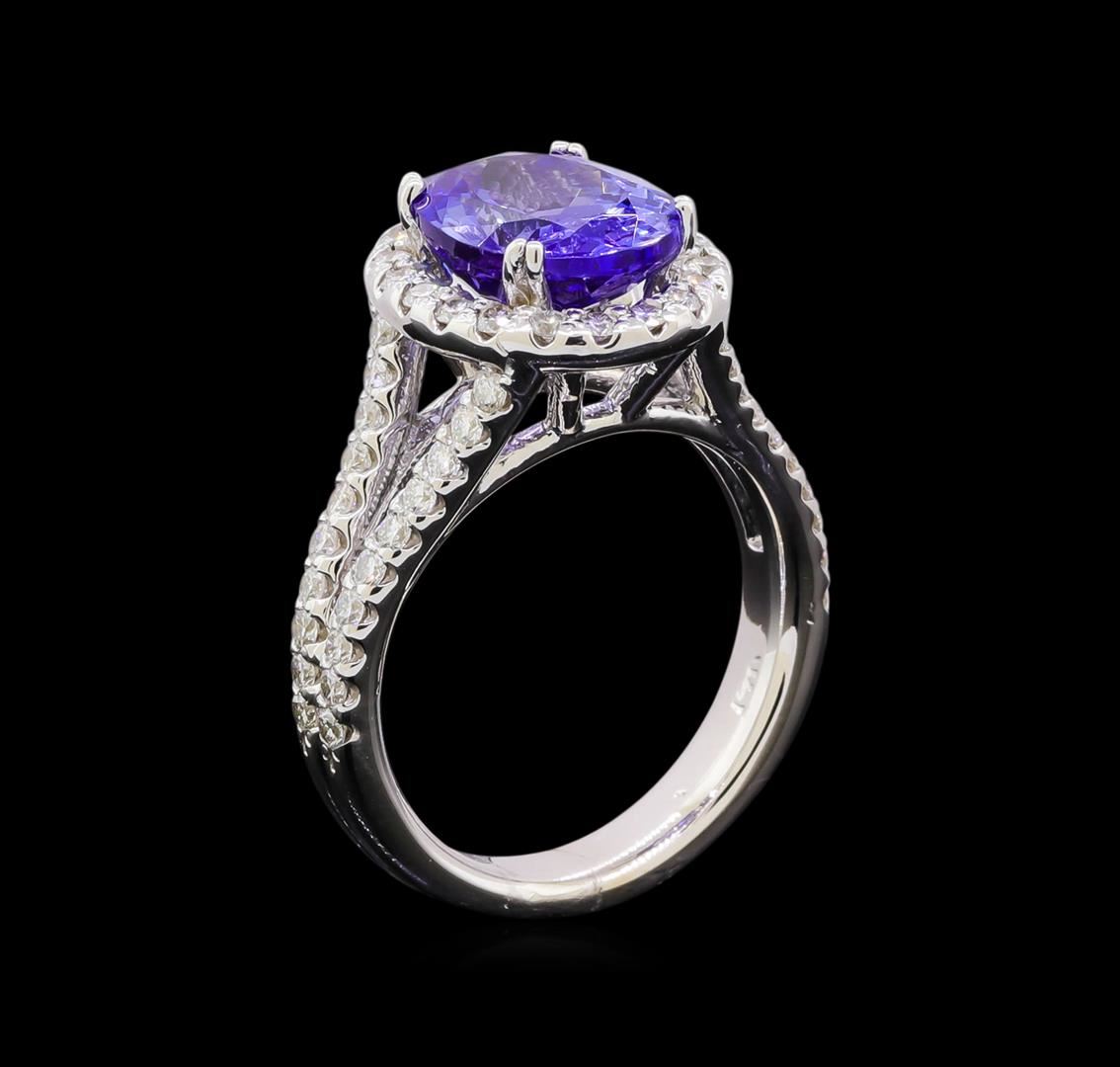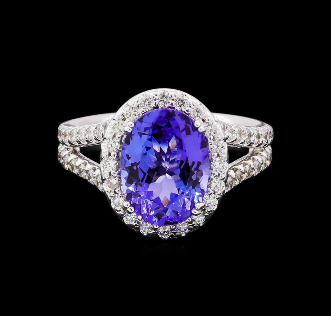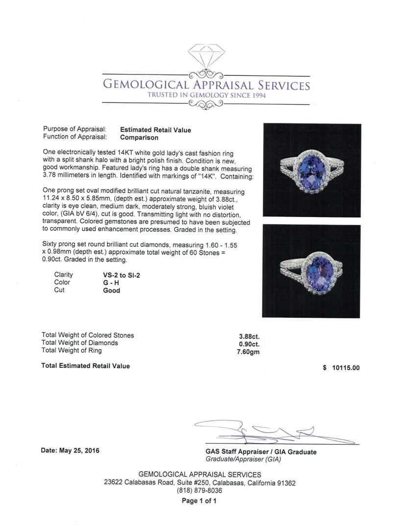 One electronically tested 14KT white gold lady's cast fashion ring with a split shank halo with a bright polish finish. Featured lady's ring has a double shank measuring 3.78 millimeters in length. Identified with markings of "14K". Condition is new, good workmanship. Containing: One prong set oval modified brilliant cut natural tanzanite, measuring 11.24 x 8.50 x 5.85mm, (depth est.) approximate weight of 3.88ct., clarity is eye clean, medium dark, moderately strong, bluish violet color, (GIA bV 6/4), cut is good. Transmitting light with no distortion, transparent. Colored gemstones are presumed to have been subjected to commonly used enhancement processes. Graded in the setting. Sixty prong set round brilliant cut diamonds, measuring 1.60 - 1.55 x 0.98mm (depth est.) approximate total weight of 60 Stones = 0.90ct. Graded in the setting. Clarity: VS-2 to SI-2. Color: G - Good. Total Weight of Colored Stones 3.88ct. Total Weight of Diamonds 0.90ct. Total Weight of Ring 7.60gm. GAS Appraised at $10,115.00.