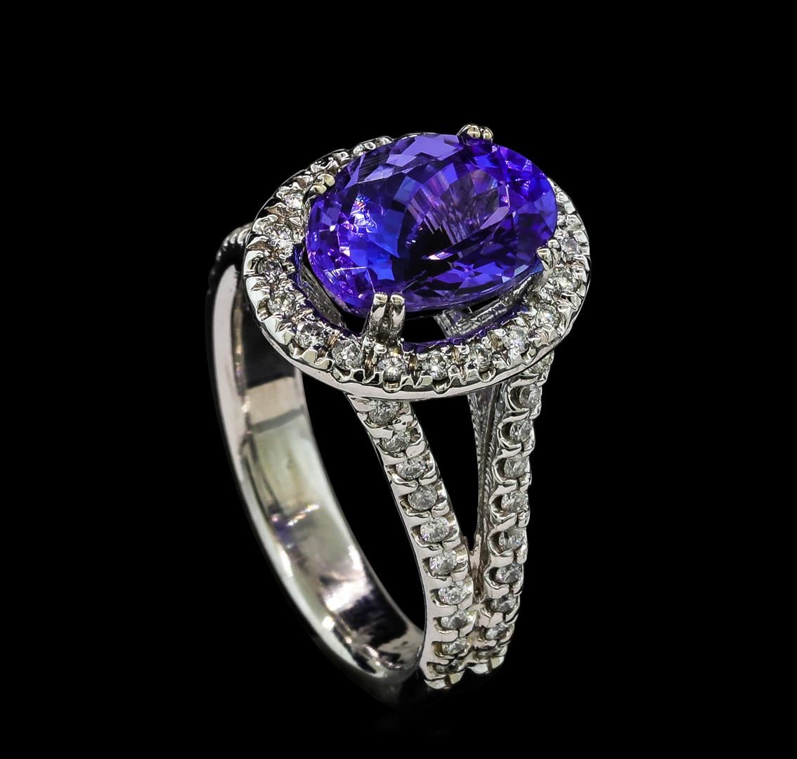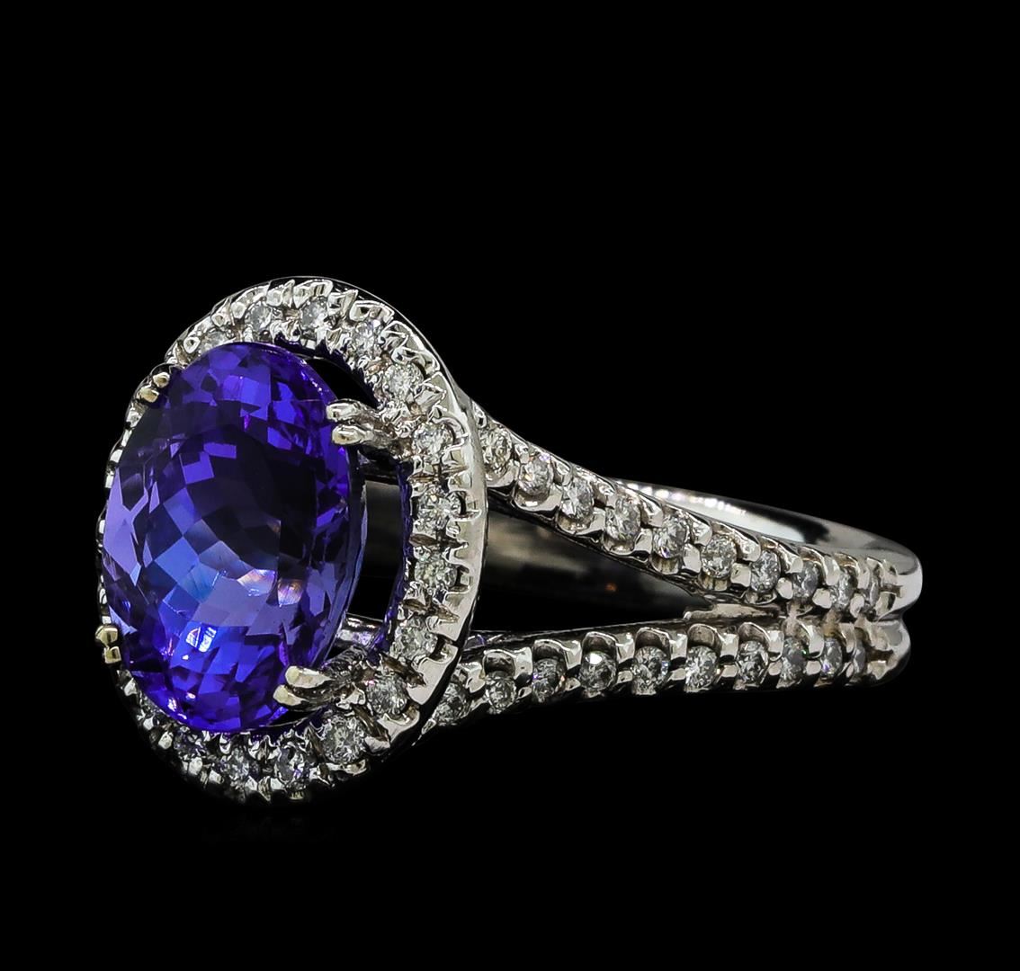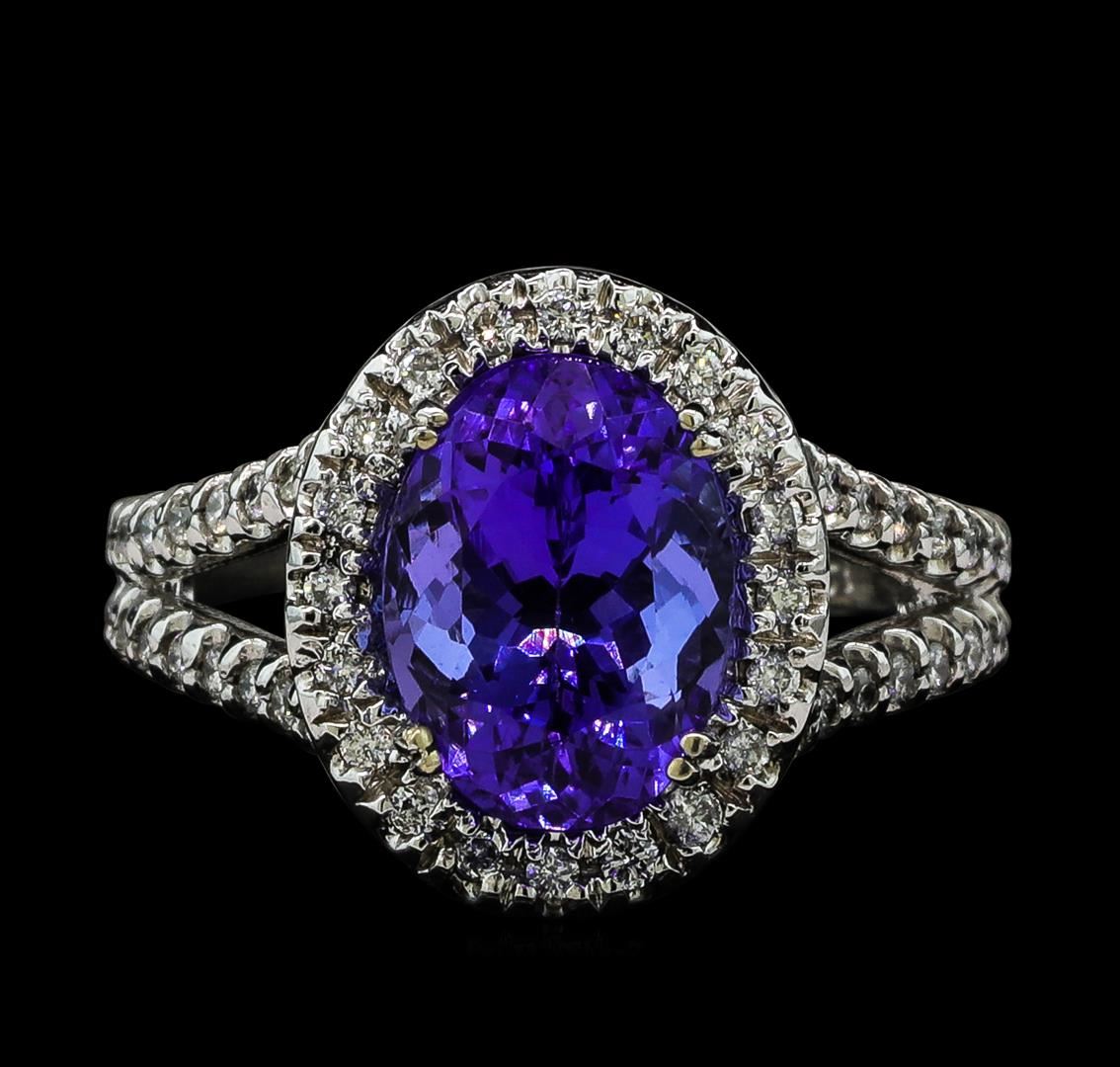 One electronically tested 14KT white gold lady's cast fashion ring with a split shank halo with a bright polish finish. The featured lady's ring has a double shank measuring 3.74 millimeters wide. Identified with markings of '14K'. Condition is new, good workmanship. Containing: One prong set oval modified brilliant cut natural tanzanite, measuring 10.72 x 7.89 x 6.67mm, (depth est.) approximate weight of 3.88ct., clarity is eye clean, medium dark, strong, violetish blue color, (GIA vB 6/5), cut is very good. Transmitting light with no distortion, transparent. Colored gemstones are presumed to have been subjected to commonly used enhancement processes. Graded in the setting. Sixty prong set round brilliant cut diamonds, measuring 1.30 - 1.20 x 0.78mm (depth est.) approximate total weight of 60 Stones = 0.46ct. Graded in the setting. Clarity SI-1 to I-1. Color: H - I Cut Good. Total Weight of Colored Stones 3.88ct.. Total Weight of Diamonds 0.46ct.. Total Weight of Ring 7.40gm. GAS Appraised at $9,360.00.