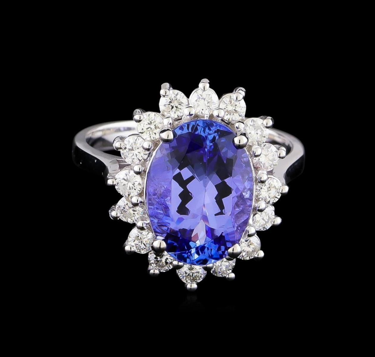 One electronically tested 14KT white gold lady's cast fashion ring with a basket halo with a bright polish finish. The featured lady's ring has a shank measuring 2.37 millimeters in width. Identified with markings of "K14". Condition is new, good workmanship. Containing: One prong set oval oval modified brilliant cut natural tanzanite, measuring 12.08 x 8.54 x 5.50mm, (depth est.) approximate weight of 3.88ct., clarity is eye clean, medium, moderately strong, violetish blue color, (GIA vB 5/4), cut is good. Transmitting light with no distortion, transparent. Colored gemstones are presumed to have been subjected to commonly used enhancement processes. Graded in the setting. Sixteen prong set round brilliant cut diamonds, measuring 2.30 - 2.20 x 1.37mm (depth est.) approximate total weight of 16 Stones = 0.68ct. Graded in the setting. Clarity: SI-1 to SI-2. Color: G - I. Cut Good. Total Weight of Colored Stones 3.88ct. Total Weight of Diamonds 0.68ct. Total Weight of Ring 5.20gm.