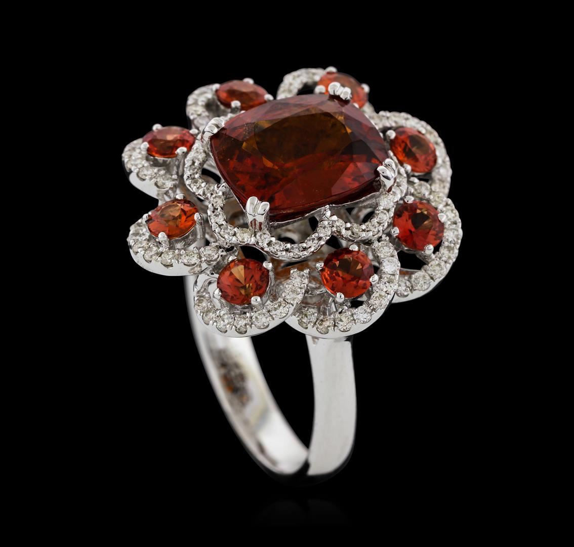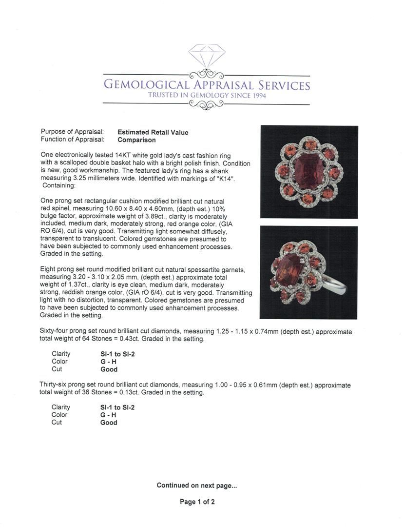One electronically tested 14KT white gold lady's cast fashion ring with a scalloped double basket halo with a bright polish finish. The featured lady's ring has a shank measuring 3.25 millimeters wide. Identified with markings of 'K14'. Condition is new, good workmanship. Containing: One prong set rectangular cushion modified brilliant cut natural red spinel, measuring 10.60 x 8.40 x 4.60mm, (depth est.) 10%. bulge factor, approximate weight of 3.89ct., clarity is moderately included, medium dark, moderately strong, red orange color, (GIA RO 6/4), cut is very good. Transmitting light somewhat diffusely, transparent to translucent. Colored gemstones are presumed to have been subjected to commonly used enhancement processes. Graded in the setting. Eight prong set round modified brilliant cut natural spessartite garnets, measuring 3.20 - 3.10 x 2.05 mm, (depth est.) approximate total weight of 1.37ct., clarity is eye clean, medium dark, moderately strong, reddish orange color, (GIA rO 6/4), cut is very good. Transmitting light with no distortion, transparent. Colored gemstones are presumed to have been subjected to commonly used enhancement processes. Graded in the setting. Sixty-Four prong set round brilliant cut diamonds, measuring 1.25 - 1.15 x 0.74mm (depth est.) approximate total weight of 64 Stones = 0.43ct. Graded in the setting. Clarity SI-1 to SI-2. Color: G - H Cut Good Thirty-Six prong set round brilliant cut diamonds, measuring 1.00 - 0.95 x 0.61mm (depth est.) approximate total weight of 36 Stones = 0.13ct. Graded in the setting. Clarity SI-1 to SI-2. Color: G - H Cut Good. Total Weight of Colored Stones 5.26ct.. Total Weight of Diamonds 0.56ct.. Total Weight of Ring 7.90gm. GAS Appraised at $9,375.00.