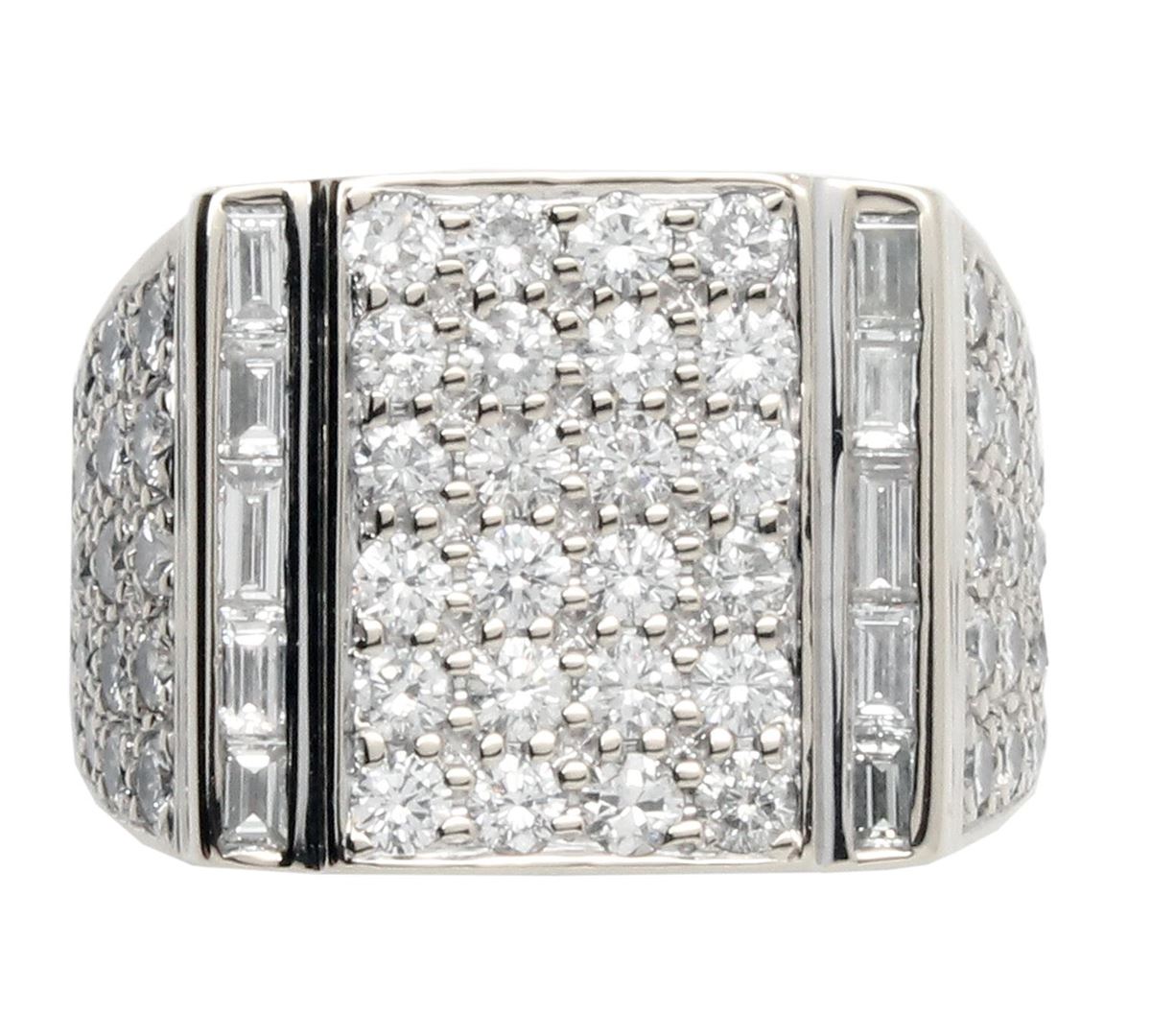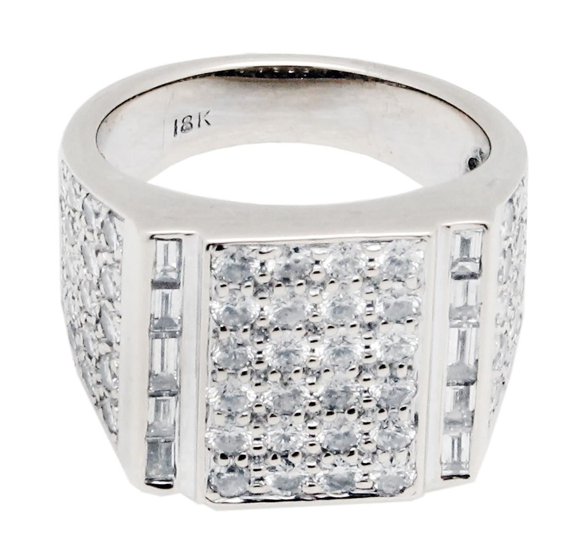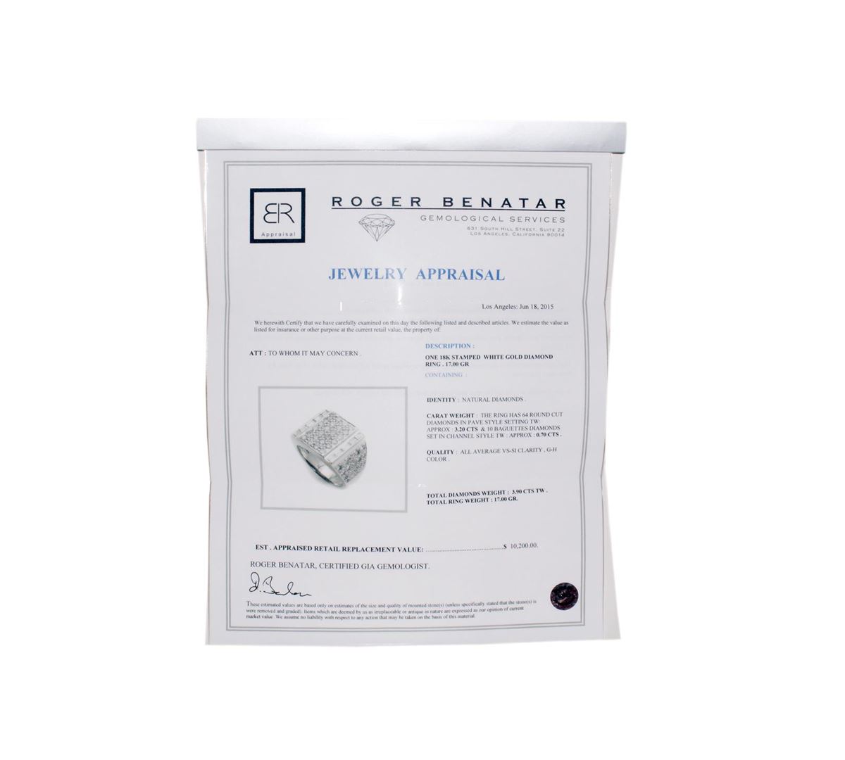 One 18 karat white gold mens cast diamond ring With a bright polish finish. Identified with markings of "18K". Condition is pre-owned. Containing: ten channel set baguette cut diamonds, measuring from 2.00 x 1.50 x 1.28mm (depth est.) to 3.00 x 1.80 x 1.53mm (depth est.) approximate total weight of 10 Stones = 0.70ct. Clarity: VS-2 to SI-1. Color: G-H, Cut is Good. Also 64 round cut diamonds in pave setting with clarity of VS-2 to SI-1, Color: G-H, Cut is Good. All diamonds are graded in the mounting, unless otherwise stated. Total Weight of Diamonds 3.90ct. Total Weight of Ring 17.00 grams. Appraised by GIA certified gemologist for $10,200. RBGS Appraised at $10,200.00.