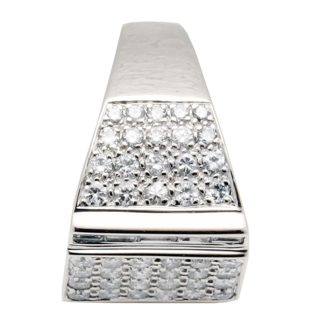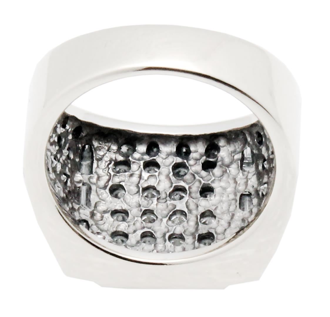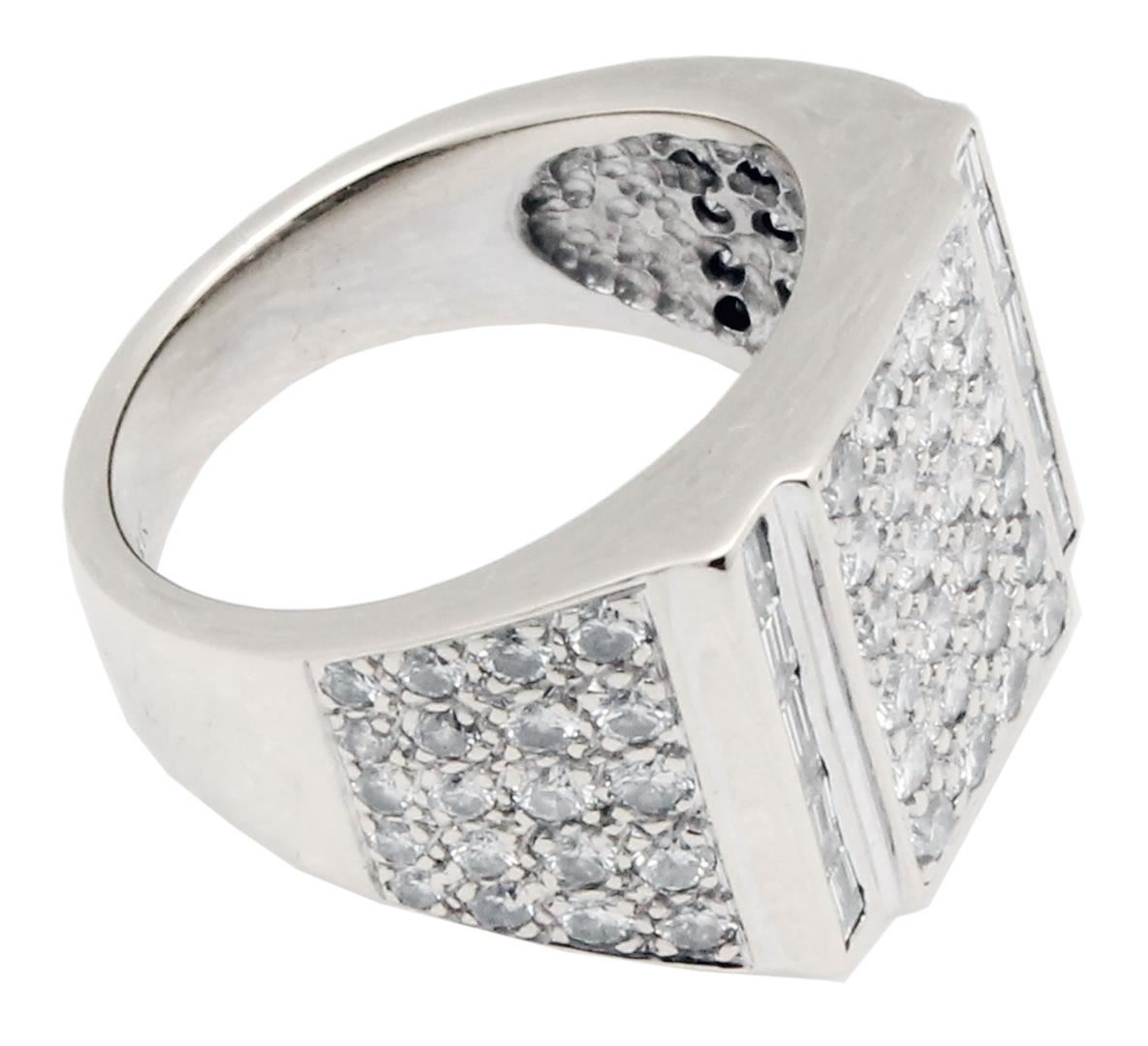 One 18 karat white gold mens cast diamond ring With a bright polish finish. Identified with markings of "18K". Condition is pre-owned. Containing: ten channel set baguette cut diamonds, measuring from 2.00 x 1.50 x 1.28mm (depth est.) to 3.00 x 1.80 x 1.53mm (depth est.) approximate total weight of 10 Stones = 0.70ct. Clarity: VS-2 to SI-1. Color: G-H, Cut is Good. Also 64 round cut diamonds in pave setting with clarity of VS-2 to SI-1, Color: G-H, Cut is Good. All diamonds are graded in the mounting, unless otherwise stated. Total Weight of Diamonds 3.90ct. Total Weight of Ring 17.00 grams. Appraised by GIA certified gemologist for $10,200. RBGS Appraised at $10,200.00.