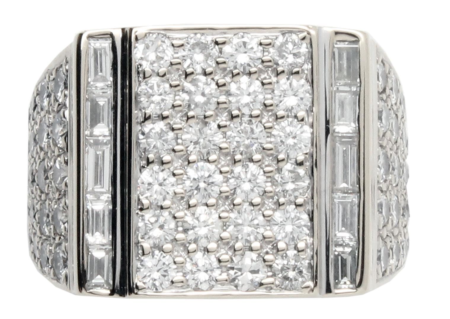 One 18 karat white gold mens cast diamond ring With a bright polish finish. Identified with markings of "18K". Condition is pre-owned. Containing: ten channel set baguette cut diamonds, measuring from 2.00 x 1.50 x 1.28mm (depth est.) to 3.00 x 1.80 x 1.53mm (depth est.) approximate total weight of 10 Stones = 0.70ct. Clarity: VS-2 to SI-1. Color: G-H, Cut is Good. Also 64 round cut diamonds in pave setting with clarity of VS-2 to SI-1, Color: G-H, Cut is Good. All diamonds are graded in the mounting, unless otherwise stated. Total Weight of Diamonds 3.90ct. Total Weight of Ring 17.00 grams. Appraised by GIA certified gemologist for $10,200. RBGS Appraised at $10,200.00.