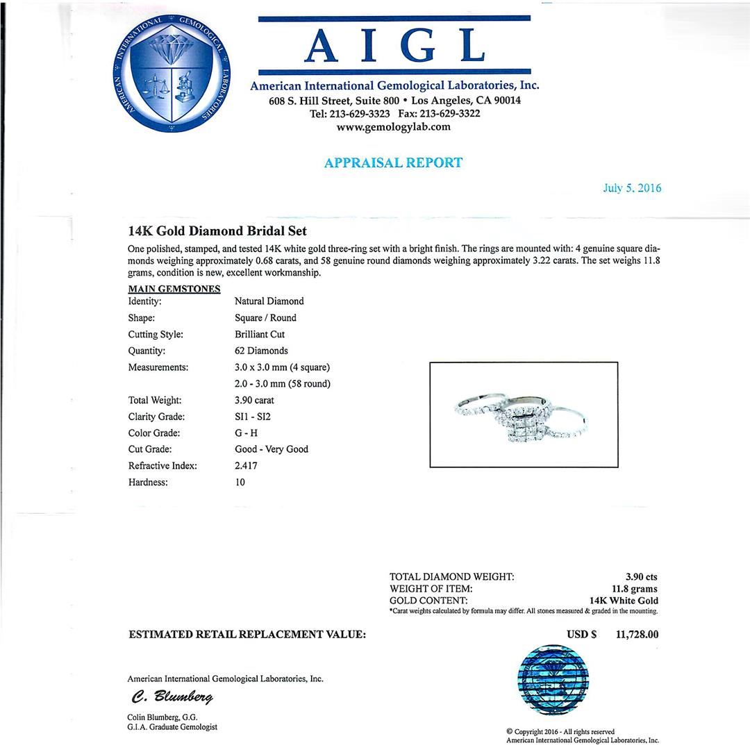 One Polished, stamped and tested 14K white gold three ring set with a bright finish. The rings are mounted with: 4 genuine square diamonds weighing approximately 0.68 carats, and 58 genuine round diamonds weighing approximately 3.22 carats. The set weighs 11.8 grams, condition is excellent, Identity: Natural Diamond, Shape: Square Round, Cutting Style: Brilliant Cut, Diamond Count: 62 Diamonds, Measurements 3.0 X 3.0mm (4 Square Diamonds) 2.0 - 3.0 MM (58 Round Diamonds), Total Weight: 3.90 carats, Color: G - H, Clarity: SI-SI2, Color Grade: G - H, Cut: Very Good, Refractive Index 2.417, Hardness: 10. This set comes with all three rings and includes an appraisal. AIGL Appraised at $11,728.00.