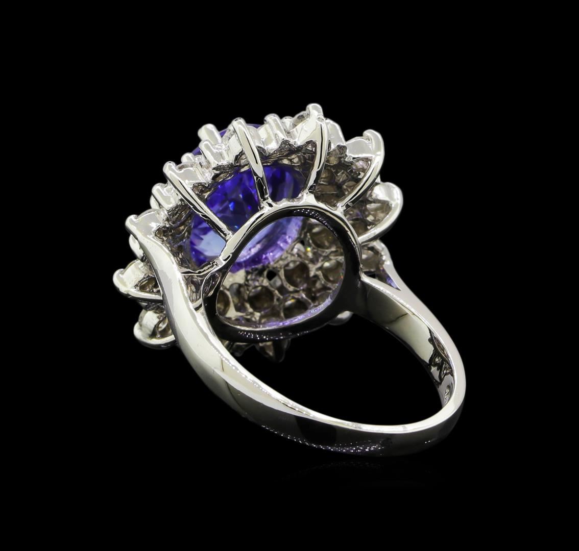 One electronically tested 14KT white gold lady's cast fashion ring with a triple basket halo with a bright polish finish. The featured lady's ring has a shank measuring 2.35 millimeters wide. Identified with markings of 'K14'. Condition is new, good workmanship. Containing: One prong set oval modified brilliant cut natural tanzanite, measuring 11.05 x 8.85 x 6.19mm, (depth est.) approximate weight of 3.90ct., clarity is eye clean, medium, very slightly grayish, bluish violet color, (GIA bV 5/3), cut is very good. Transmitting light with no distortion, transparent. Colored gemstones are presumed to have been subjected to commonly used enhancement processes. Graded in the setting. Thirty-Six prong set round brilliant cut diamonds, measuring 2.40 - 2.30 x 1.46mm (depth est.) approximate total weight of 36 Stones = 1.80ct. Graded in the setting. Clarity VS-2 to SI-2. Color: H - I Cut Good. Total Weight of Colored Stones 3.90ct.. Total Weight of Diamonds 1.80ct.. Total Weight of Ring 7.70gm. GAS Appraised at $11,510.00.