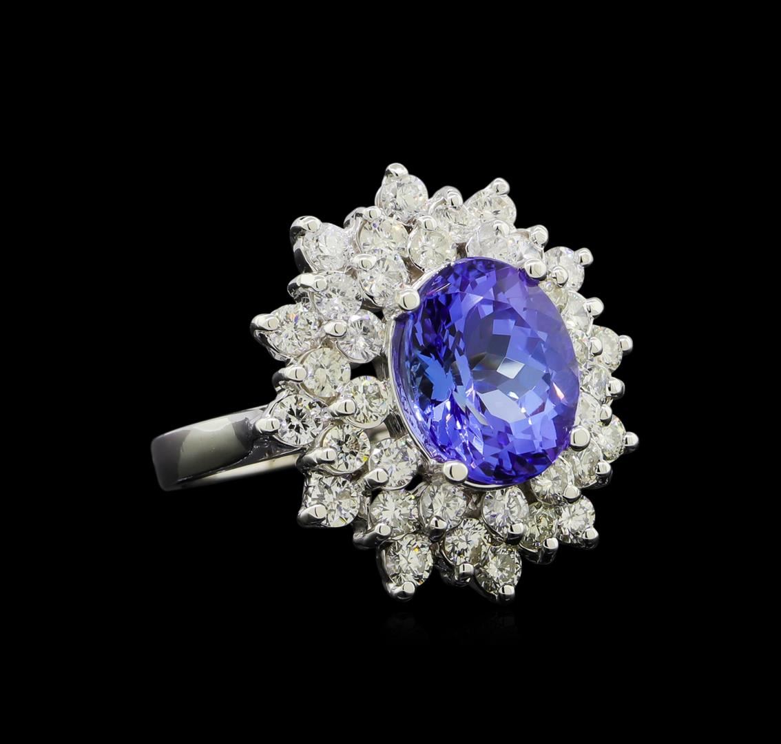 One electronically tested 14KT white gold lady's cast fashion ring with a triple basket halo with a bright polish finish. The featured lady's ring has a shank measuring 2.35 millimeters wide. Identified with markings of 'K14'. Condition is new, good workmanship. Containing: One prong set oval modified brilliant cut natural tanzanite, measuring 11.05 x 8.85 x 6.19mm, (depth est.) approximate weight of 3.90ct., clarity is eye clean, medium, very slightly grayish, bluish violet color, (GIA bV 5/3), cut is very good. Transmitting light with no distortion, transparent. Colored gemstones are presumed to have been subjected to commonly used enhancement processes. Graded in the setting. Thirty-Six prong set round brilliant cut diamonds, measuring 2.40 - 2.30 x 1.46mm (depth est.) approximate total weight of 36 Stones = 1.80ct. Graded in the setting. Clarity VS-2 to SI-2. Color: H - I Cut Good. Total Weight of Colored Stones 3.90ct.. Total Weight of Diamonds 1.80ct.. Total Weight of Ring 7.70gm. GAS Appraised at $11,510.00.