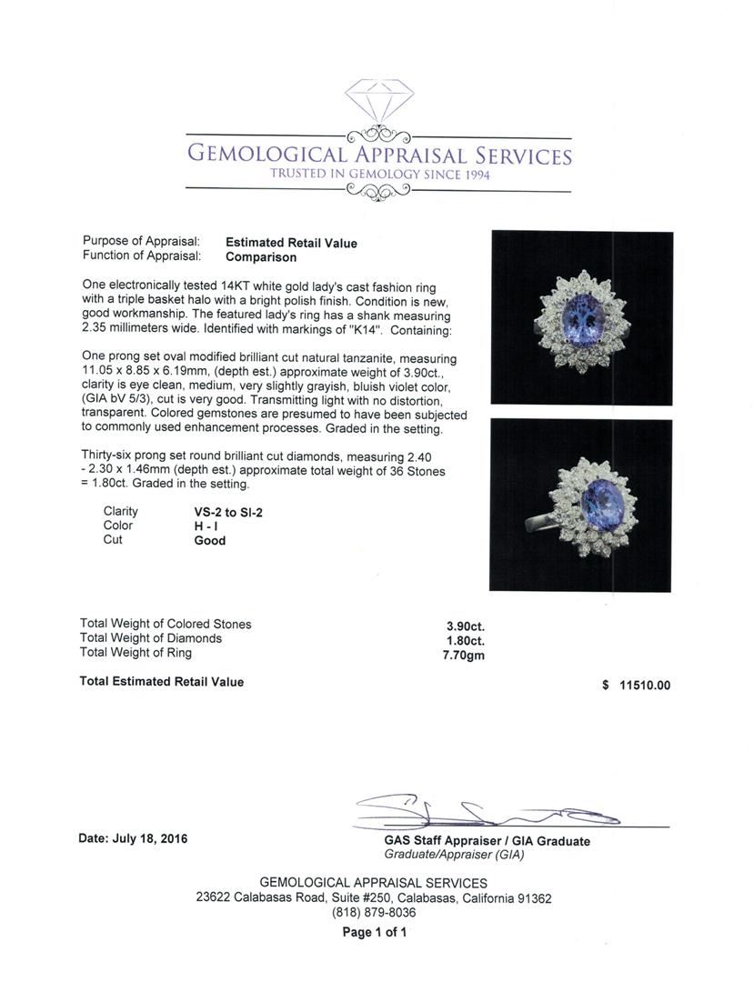 One electronically tested 14KT white gold lady's cast fashion ring with a triple basket halo with a bright polish finish. The featured lady's ring has a shank measuring 2.35 millimeters wide. Identified with markings of 'K14'. Condition is new, good workmanship. Containing: One prong set oval modified brilliant cut natural tanzanite, measuring 11.05 x 8.85 x 6.19mm, (depth est.) approximate weight of 3.90ct., clarity is eye clean, medium, very slightly grayish, bluish violet color, (GIA bV 5/3), cut is very good. Transmitting light with no distortion, transparent. Colored gemstones are presumed to have been subjected to commonly used enhancement processes. Graded in the setting. Thirty-Six prong set round brilliant cut diamonds, measuring 2.40 - 2.30 x 1.46mm (depth est.) approximate total weight of 36 Stones = 1.80ct. Graded in the setting. Clarity VS-2 to SI-2. Color: H - I Cut Good. Total Weight of Colored Stones 3.90ct.. Total Weight of Diamonds 1.80ct.. Total Weight of Ring 7.70gm. GAS Appraised at $11,510.00.