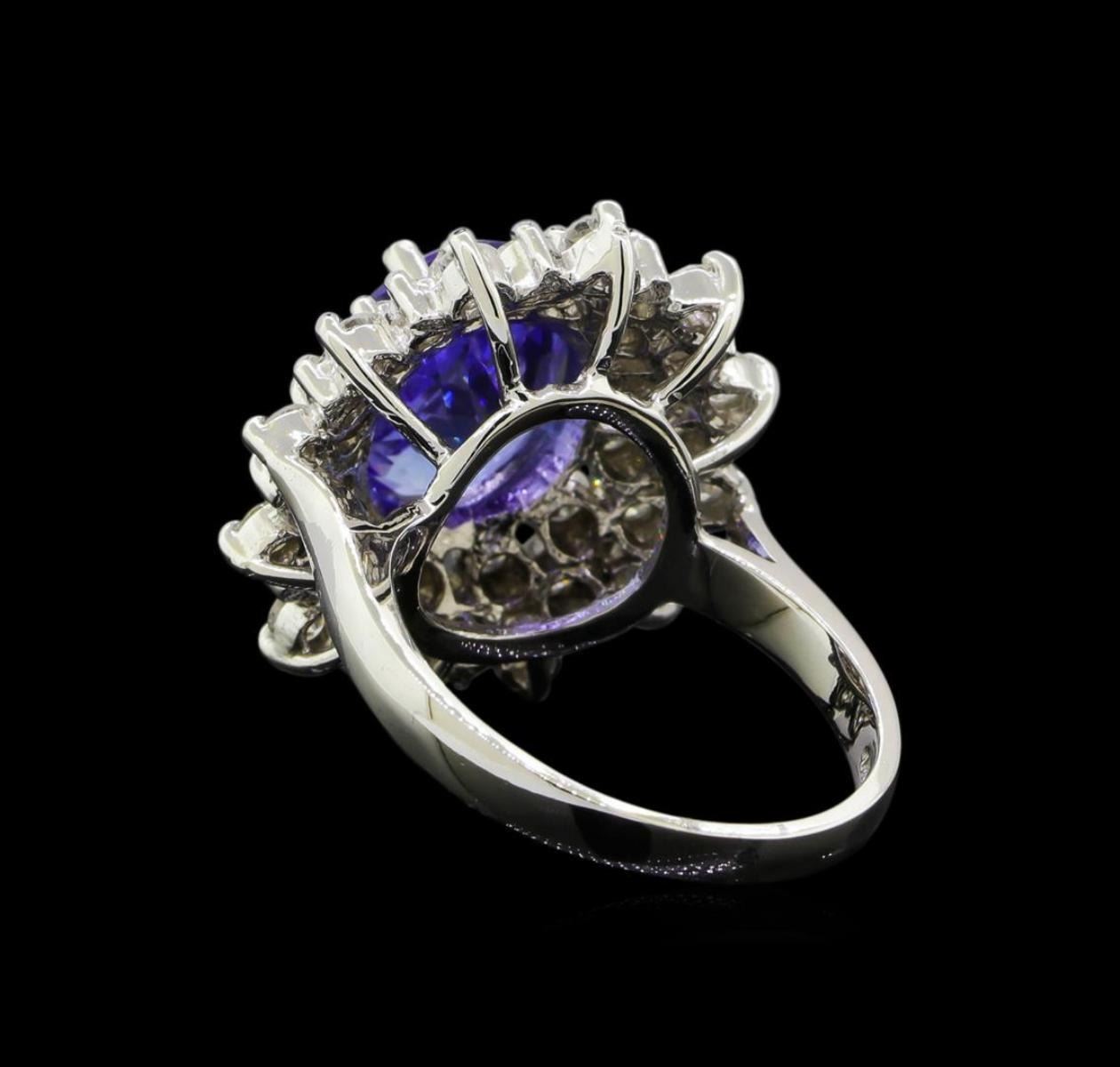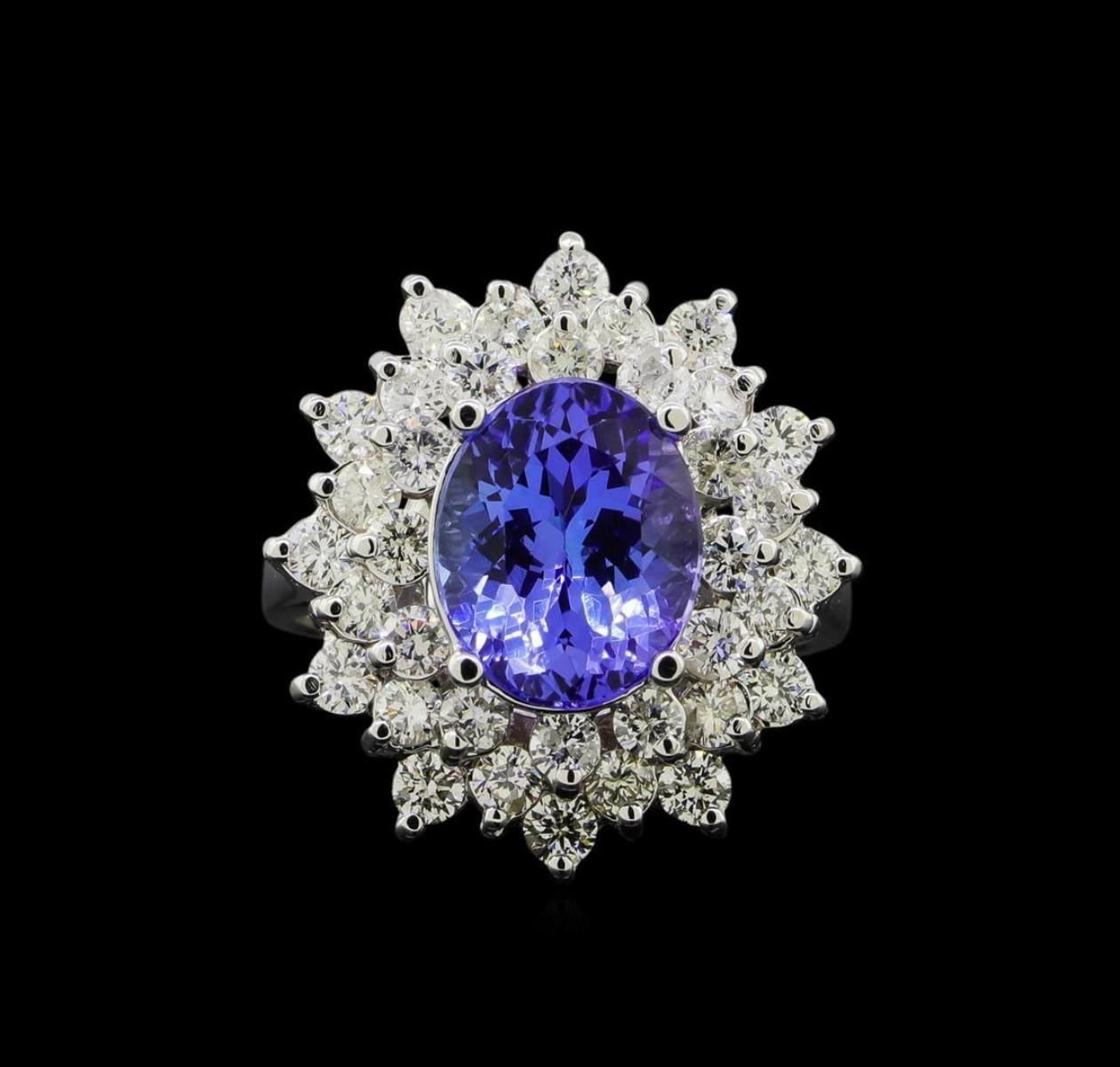 One electronically tested 14KT white gold lady's cast fashion ring with a triple basket halo with a bright polish finish. The featured lady's ring has a shank measuring 2.35 millimeters wide. Identified with markings of 'K14'. Condition is new, good workmanship. Containing: One prong set oval modified brilliant cut natural tanzanite, measuring 11.05 x 8.85 x 6.19mm, (depth est.) approximate weight of 3.90ct., clarity is eye clean, medium, very slightly grayish, bluish violet color, (GIA bV 5/3), cut is very good. Transmitting light with no distortion, transparent. Colored gemstones are presumed to have been subjected to commonly used enhancement processes. Graded in the setting. Thirty-Six prong set round brilliant cut diamonds, measuring 2.40 - 2.30 x 1.46mm (depth est.) approximate total weight of 36 Stones = 1.80ct. Graded in the setting. Clarity VS-2 to SI-2. Color: H - I Cut Good. Total Weight of Colored Stones 3.90ct.. Total Weight of Diamonds 1.80ct.. Total Weight of Ring 7.70gm. GAS Appraised.
