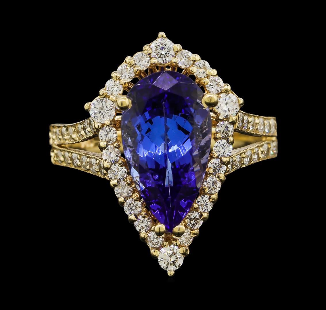 One electronically tested 14KT yellow gold lady's cast fashion ring with a split shank basket halo with a bright polish with milgrain detailing finish. The featured lady's ring has a shank measuring 2.69 millimeters wide. Identified with markings of 'K14'. Condition is new, good workmanship. Containing: One prong set pear modified brilliant cut natural tanzanite, measuring 13.60 x 7.57 x 5.70mm, (depth est.) approximate weight of 3.90ct., clarity is eye clean, medium dark, moderately strong, violetish blue color, (GIA vB 6/4), cut is very good. Transmitting light with no distortion, transparent. Colored gemstones are presumed to have been subjected to commonly used enhancement processes. Graded in the setting. Four prong set round brilliant cut diamonds, measuring 2.30 - 2.20 x 1.37mm (depth est.) approximate total weight of 4 Stones = 0.17ct. Graded in the setting. Clarity VS-2 to SI-2. Color: H - I Cut Good Forty-Eight prong set round brilliant cut diamonds, measuring 1.60 - 1.45 x 0.95mm (depth est.) approximate total weight of 48 Stones = 0.65ct. Graded in the setting. Clarity SI-1 to I-1. Color: G - I Cut Good. Total Weight of Colored Stones 3.90ct.. Total Weight of Diamonds 0.82ct.. Total Weight of Ring 5.90gm. GAS Appraised at $9,795.00.