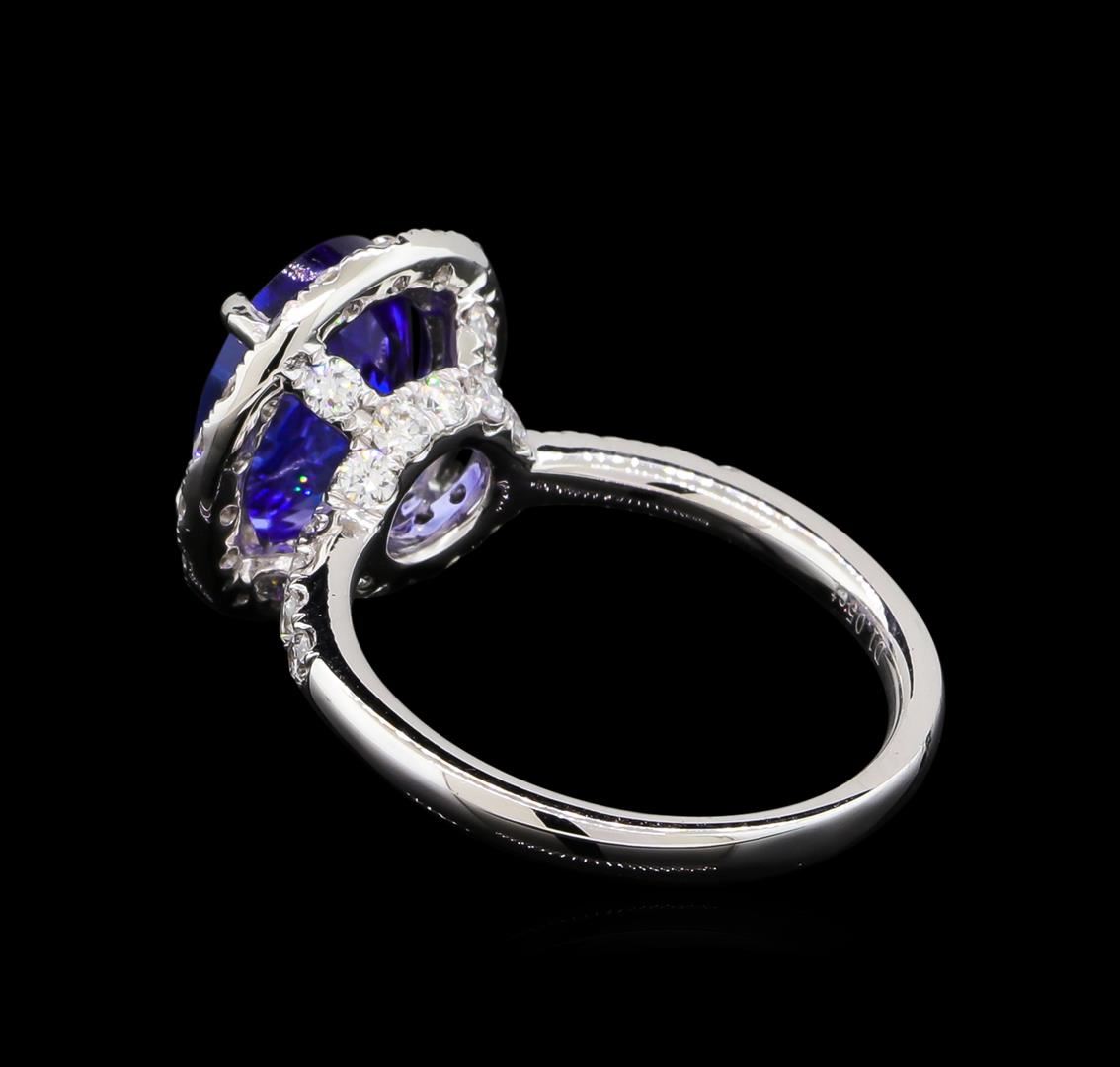 One electronically tested platinum lady's cast fashion ring with a cathedral halo with a bright polish finish. The featured lady's ring has a shank measuring 2.57 millimeters wide. Trademark is Orianne. Identified with markings of "PT 950". Condition is new, good workmanship. Containing: One prong set oval modified brilliant cut natural tanzanite, measuring 11.15 x 9.03 x 5.08mm, 8%. bulge factor, approximate weight of 3.90ct., clarity is eye clean, type I, medium dark, moderately strong, violetish blue color, (GIA vB 6/4), cut is excellent. Transmitting light with no distortion, transparent. Colored gemstones are presumed to have been subjected to commonly used enhancement processes. Graded in the setting. Forty prong set round brilliant cut diamonds, measuring 1.95 - 1.85 x 1.18mm (depth est.) approximate total weight of 40 Stones = 1.05ct. Graded in the setting. Clarity: VS-2 to SI-1. Color: F - Very Good. Total Weight of Colored Stones 3.90ct. Total Weight of Diamonds 1.05ct. Total Weight of Ring 7.80gm. GAS Appraised at $11,635.00.
