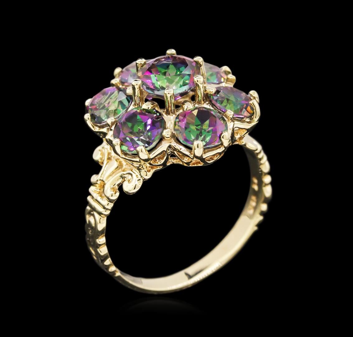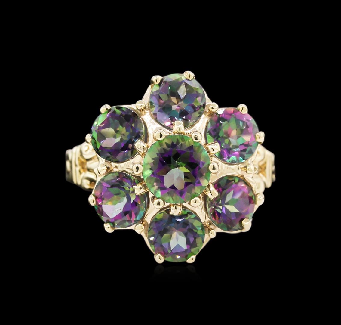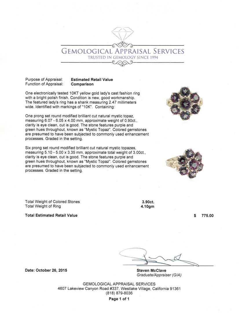 One electronically tested 10KT yellow gold lady's cast fashion ring with a bright polish finish. The featured lady's ring has a shank measuring 2.47 millimeters wide. Identified with markings of "10K". Condition is new, good workmanship. Containing: One prong set round modified brilliant cut natural mystic topaz, measuring 6.07 - 6.05 x 4.00 mm, approximate weight of 0.90ct., clarity is eye clean, cut is good. The stone features purple and green hues throughout, known as "Mystic Topaz". Colored gemstones are presumed to have been subjected to commonly used enhancement processes. Graded in the setting. Six prong set round modified brilliant cut natural mystic topazes, measuring 5.10 - 5.00 x 3.35 mm, approximate total weight of 3.00ct., clarity is eye clean, cut is good. The stone features purple and green hues throughout, known as "Mystic Topaz". Colored gemstones are presumed to have been subjected to commonly used enhancement processes. Graded in the setting. Total Weight of Colored Stones 3.90ct. Total Weight of Ring 4.10gm. GAS Appraised at $775.00.