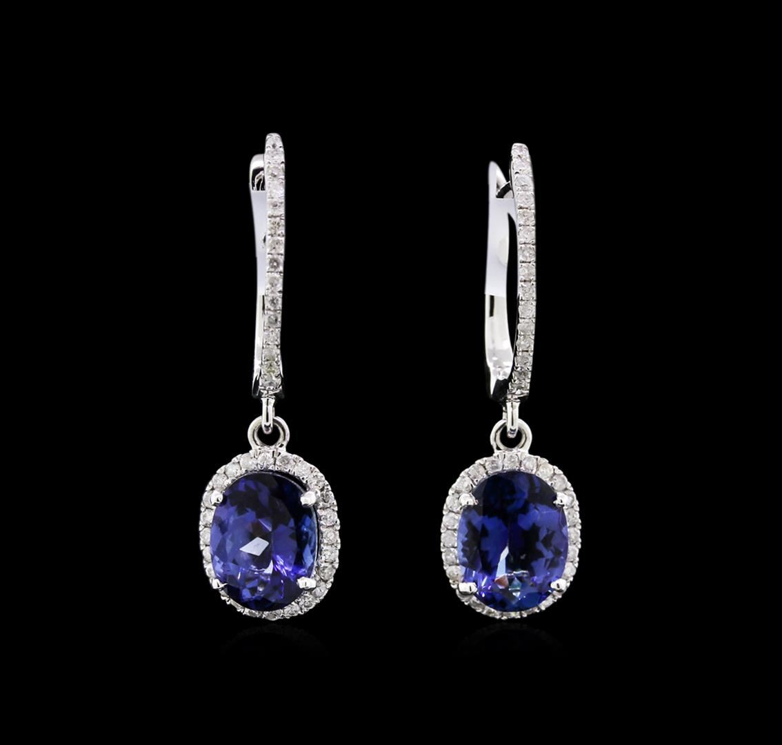 One pair electronically tested 14KT white gold ladies cast & assembled tanzanite and diamond dangle earrings with hinged, snap locking posts. Bright polish finish. Trademark is Orianne. Identified with markings of "14K". Condition is new, good workmanship. Containing: Two prong set oval mixed cut natural tanzanite, measuring 8.50 x 6.50 x 4.40mm, 15% bulge factor, approximate total weight of 3.91ct., clarity is eye clean, type I, dark, very slightly grayish, violetish blue color, (GIA vB 7/3), cut is good. Natural tanzanite, color enhanced due to cobalt coating. The presence of the coating prevents determining the stone's actual depth of color. Transmitting light with no distortion, transparent. Measurements & the color grade are an average for the pair. Grading in the setting. The cobalt coated Tanzanite has a low tolerance to ultrasonic cleaning, and should not be cleaned using this method. Tanzanite is a very rare gemstone that is only found in the country of Tanzania. Originally discovered in 1967. Tiffany & Company, named the stone Tanzanite. It is found in the Usumburu Mountains that border the Umba Valley of northern Tanzania. Tanzanite occurs in gray, brown, violet, blue, reddish-purple, & green. The gem is interesting because of its exceptional pleochroism. Rotated in different directions a tanzanite will exhibit multiple changes of color. Seventy-Eight prong set round brilliant cut diamonds, measuring 1.10 - 1.00 x 0.63mm (depth est.) approximate total weight of 78 Stones = 0.42ct. Graded in the setting. Clarity: I-1 to I-2. Color: G - I. Total Weight of Colored Stones 3.91ct. Total Weight of Diamonds 0.42ct. AIG Appraised at $3,800.00.