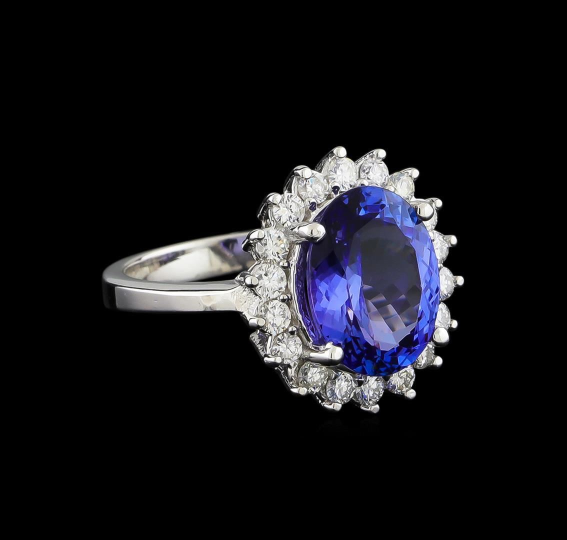 One electronically tested 14KT white gold ladies cast tanzanite and diamond ring with a bright polish finish. The featured tanzanite is set within a diamond floret, completed by a two millimeter wide band. Identified with markings of "14K". Condition is new, good workmanship. Containing: One prong set oval mixed cut natural tanzanite, measuring 11.50 x 8.90 x 5.20mm, exact weight 3.91ct., clarity is eye clean, type I, medium dark, very slightly grayish, bluish violet color, (GIA bV 6/3), cut is good. Transmitting light with no distortion, transparent. Graded in the setting. Tanzanite is a very rare gemstone that is only found in the country of Tanzania. Originally discovered in 1967. Tiffany & Company, named the stone Tanzanite. It is found in the Usumburu Mountains that border the Umba Valley of northern Tanzania. Tanzanite occurs in gray, brown, violet, blue, reddish-purple, & green. The gem is interesting because of its exceptional pleochroism. Rotated in different directions a tanzanite will exhibit multiple changes of color. Tanzanite has a low tolerance to ultrasonic cleaning, and should not be cleaned using this method. Eighteen prong set round brilliant cut diamonds, measuring 2.10 - 2.00 x 1.23mm exact total weight 18 Stones = 0.60ct. Graded in the setting. Clarity: SI-2 to I-1. Color: F - H. Total Weight of Colored Stones 3.91ct. Total Weight of Diamonds 0.60ct. Total Weight of Ring 5.72gm. AIG Appraised at $11,140.00.