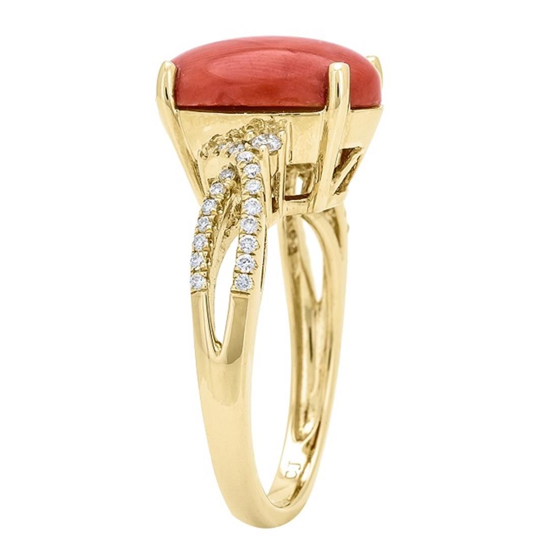 One Coral and Diamond Ring featuring: 14KT Yellow Gold with a total weight of 4.47 grams, Coral with a total weight of 3.92ct, and 38 Round Cut Diamonds with a total weight of 0.22ctw.