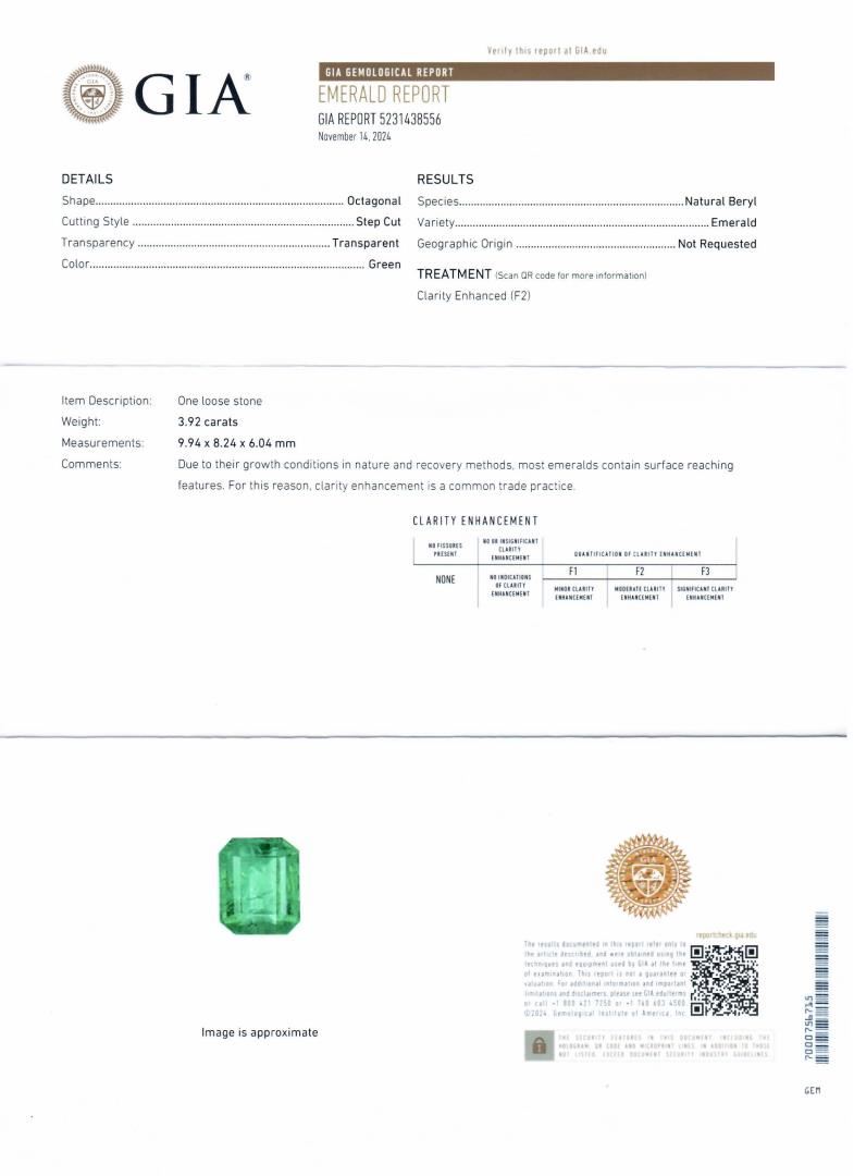 One polished, stamped, and tested platinum ring marked Oscar Friedman. The ring is mounted with: 1 genuine GIA certified emerald center stone weighing 3.92 carats, and 80 genuine round diamonds weighing approximately 0.85 carats. This item weighs 10.8 grams, condition is new, excellent workmanship. #MAIN GEMSTONE# GIA Report No.: 5231438556; Species: Natural Beryl; Variety: Emerald; Shape: Octagonal; Cutting Style: Step Cut; Measurements: 9.94 x 8.24 x 6.04mm; Weight: 3.92 carats; Color: Green; Transparency: Transparent; Treatment: Moderate (F2); Refractive Index: 1.564 - 1.595 DR; Birefringence: 0.005 to 0.009; Hardness: 7.5 - 8 #ADJACENT GEMSTONES ON RING# Identity: Natural Diamond; Shape: Round; Cutting Style: Brilliant Cut; Quantity: 80 Diamonds; Measurements: 1.0 - 2.0mm; Total Weight: 0.85 carats; Color Grade: F-G; Clarity Grade: VS2-SI1; Refractive Index: 2.417; Hardness: 10 #EMERALD WEIGHT: 3.92 ct; TOTAL DIAMOND WEIGHT: 0.85 cts; WEIGHT OF ITEM: 10.8 grams; METAL: Platinum #Size: 7