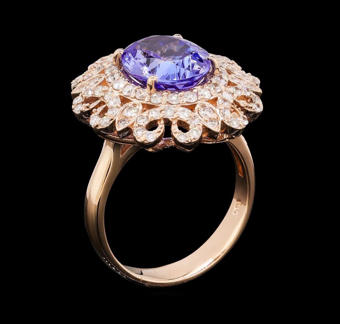 One electronically tested 14KT rose gold lady's cast fashion ring with a scalloped double basket halo with a bright polish finish. The featured lady's ring has a shank measuring 3.88 millimeters wide. Identified with markings of 'K14'. Condition is new, good workmanship. Containing: One prong set oval modified brilliant cut natural tanzanite, measuring 11.15 x 8.96 x 5.32mm, (depth est.) 5%. bulge factor, approximate weight of 3.92ct., clarity is eye clean, medium, moderately strong, violet color, (GIA V 5/4), cut is good. Transmitting light with no distortion, transparent. Colored gemstones are presumed to have been subjected to commonly used enhancement processes. Graded in the setting. Twenty-Eight prong set round brilliant cut diamonds, measuring 1.60 - 1.50 x 0.96mm (depth est.) approximate total weight of 28 Stones = 0.40ct. Graded in the setting. Clarity SI-1 to SI-2. Color: H - I Cut Good Forty-Eight prong set round brilliant cut diamonds, measuring 1.40 - 1.35 x 0.86mm (depth est.) approximate total weight of 48 Stones = 0.48ct. Graded in the setting. Clarity SI-1 to I-1. Color: H - I Cut Good Twelve prong set round brilliant cut diamonds, measuring 1.25 - 1.15 x 0.74mm (depth est.) approximate total weight of 12 Stones = 0.08ct. Graded in the setting. Clarity SI-1 to I-1. Color: G - H Cut Good. Total Weight of Colored Stones 3.92ct.. Total Weight of Diamonds 0.96ct.. Total Weight of Ring 8.10gm. GAS Appraised at $9,260.00.