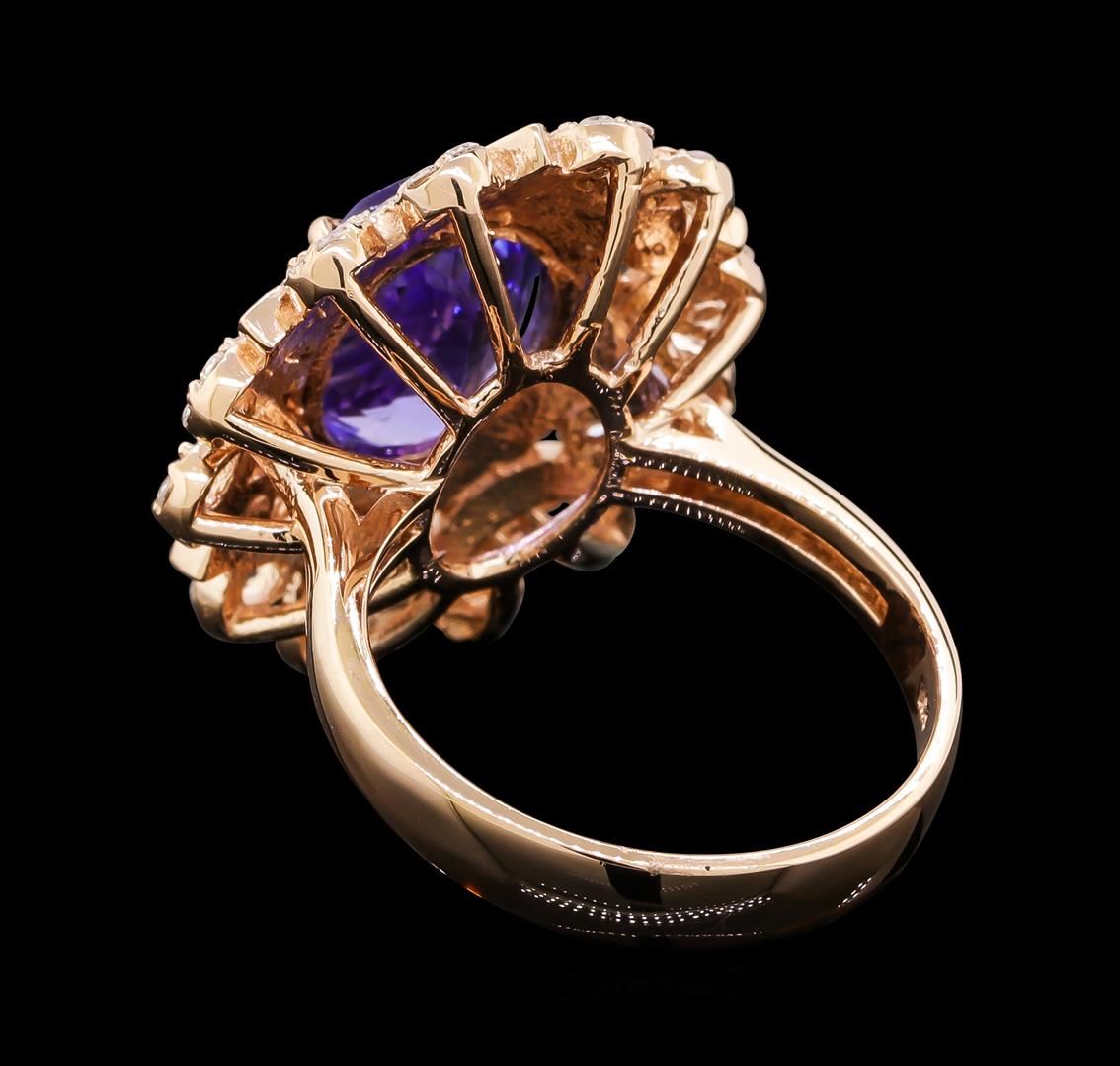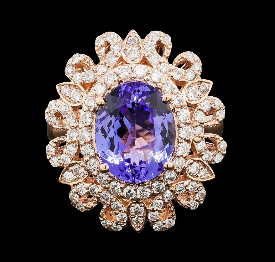 One electronically tested 14KT rose gold lady's cast fashion ring with a scalloped double basket halo with a bright polish finish. The featured lady's ring has a shank measuring 3.88 millimeters wide. Identified with markings of 'K14'. Condition is new, good workmanship. Containing: One prong set oval modified brilliant cut natural tanzanite, measuring 11.15 x 8.96 x 5.32mm, (depth est.) 5%. bulge factor, approximate weight of 3.92ct., clarity is eye clean, medium, moderately strong, violet color, (GIA V 5/4), cut is good. Transmitting light with no distortion, transparent. Colored gemstones are presumed to have been subjected to commonly used enhancement processes. Graded in the setting. Twenty-Eight prong set round brilliant cut diamonds, measuring 1.60 - 1.50 x 0.96mm (depth est.) approximate total weight of 28 Stones = 0.40ct. Graded in the setting. Clarity SI-1 to SI-2. Color: H - I Cut Good Forty-Eight prong set round brilliant cut diamonds, measuring 1.40 - 1.35 x 0.86mm (depth est.) approximate total weight of 48 Stones = 0.48ct. Graded in the setting. Clarity SI-1 to I-1. Color: H - I Cut Good Twelve prong set round brilliant cut diamonds, measuring 1.25 - 1.15 x 0.74mm (depth est.) approximate total weight of 12 Stones = 0.08ct. Graded in the setting. Clarity SI-1 to I-1. Color: G - H Cut Good. Total Weight of Colored Stones 3.92ct.. Total Weight of Diamonds 0.96ct.. Total Weight of Ring 8.10gm. GAS Appraised at $9,260.00.