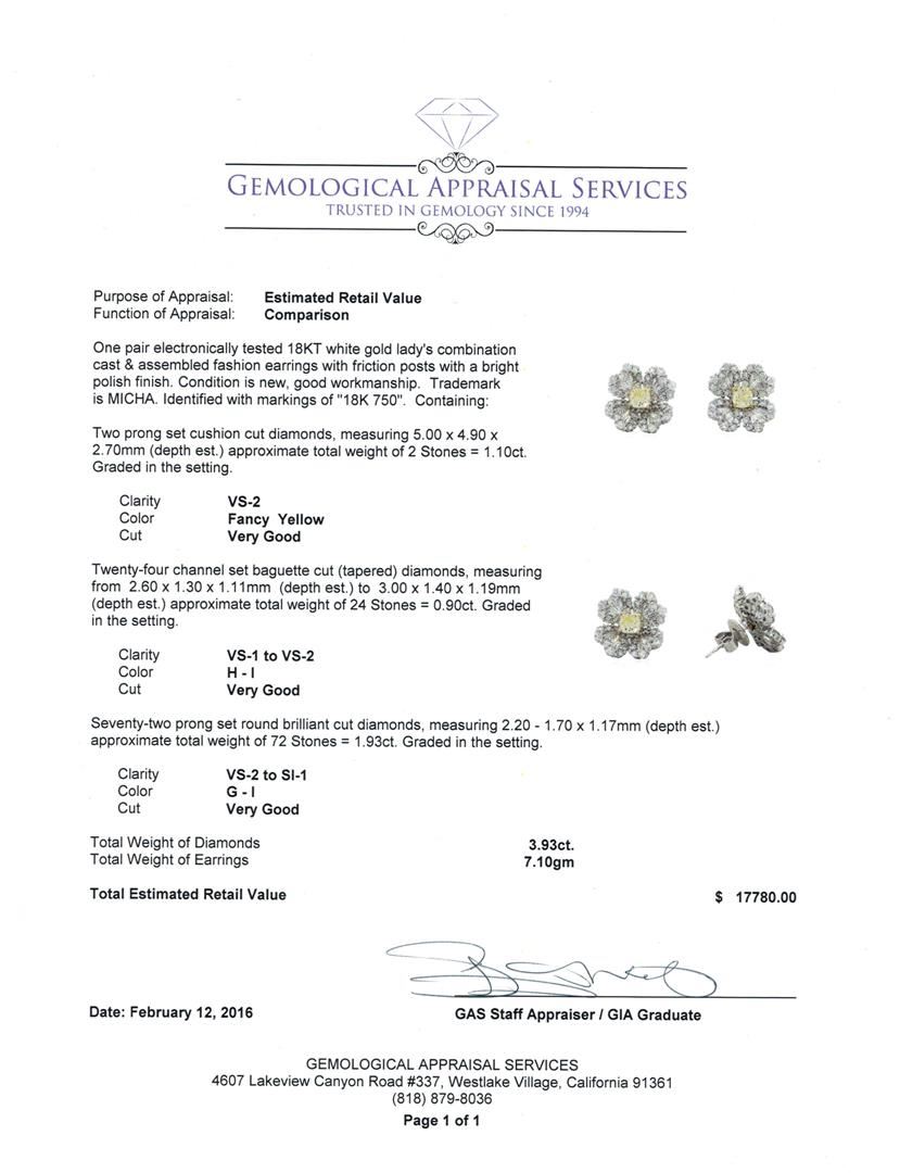 One pair electronically tested 18KT white gold lady's combination cast & assembled fashion earrings with friction posts with a bright polish finish. Trademark is MICHA. Identified with markings of "18K 750". Condition is new, good workmanship. Containing: Two prong set cushion cut diamonds, measuring 5.00 x 4.90 x 2.70mm (depth est.) approximate total weight of 2 Stones = 1.10ct. Graded in the setting. Clarity: VS-2 Cut Very Good Twenty-Four channel set baguette cut (tapered) diamonds, measuring from 2.60 x 1.30 x 1.11mm (depth est.) to 3.00 x 1.40 x 1.19mm (depth est.) approximate total weight of 24 Stones = 0.90ct. Graded in the setting. Clarity: VS-1 to VS-2. Color: H - I. Cut Very Good Seventy-Two prong set round brilliant cut diamonds, measuring 2.20 - 1.70 x 1.17mm (depth est.) approximate total weight of 72 Stones = 1.93ct. Graded in the setting. Clarity: VS-2 to SI-1. Color: G - I. Cut Very Good. Total Weight of Diamonds 3.93ct. Total Weight of Earrings 7.10gm. GAS Appraised at $17,780.00.