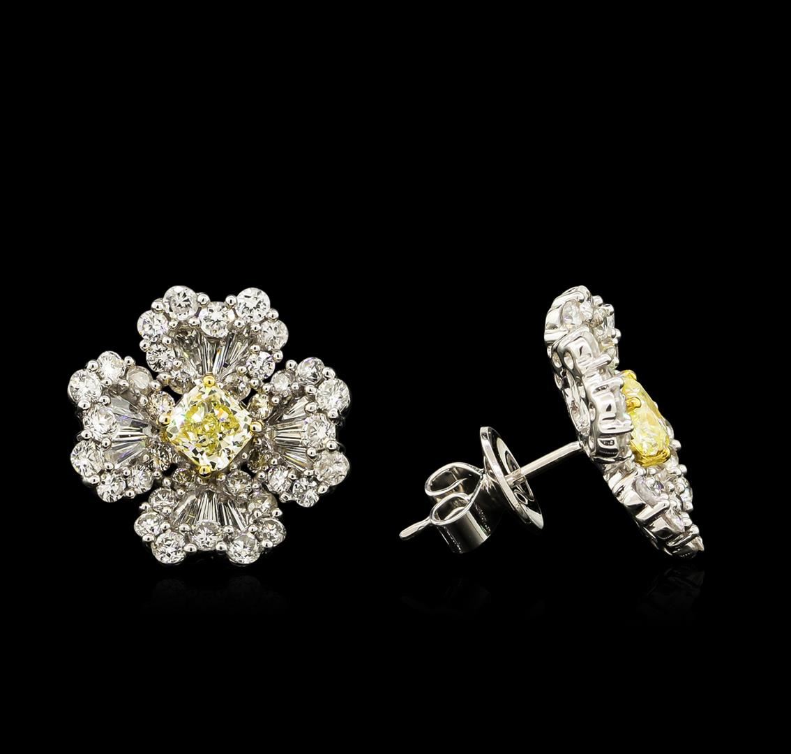 One pair electronically tested 18KT white gold lady's combination cast & assembled fashion earrings with friction posts with a bright polish finish. Trademark is MICHA. Identified with markings of "18K 750". Condition is new, good workmanship. Containing: Two prong set cushion cut diamonds, measuring 5.00 x 4.90 x 2.70mm (depth est.) approximate total weight of 2 Stones = 1.10ct. Graded in the setting. Clarity: VS-2 Cut Very Good Twenty-Four channel set baguette cut (tapered) diamonds, measuring from 2.60 x 1.30 x 1.11mm (depth est.) to 3.00 x 1.40 x 1.19mm (depth est.) approximate total weight of 24 Stones = 0.90ct. Graded in the setting. Clarity: VS-1 to VS-2. Color: H - I. Cut Very Good Seventy-Two prong set round brilliant cut diamonds, measuring 2.20 - 1.70 x 1.17mm (depth est.) approximate total weight of 72 Stones = 1.93ct. Graded in the setting. Clarity: VS-2 to SI-1. Color: G - I. Cut Very Good. Total Weight of Diamonds 3.93ct. Total Weight of Earrings 7.10gm. GAS Appraised at $17,780.00.