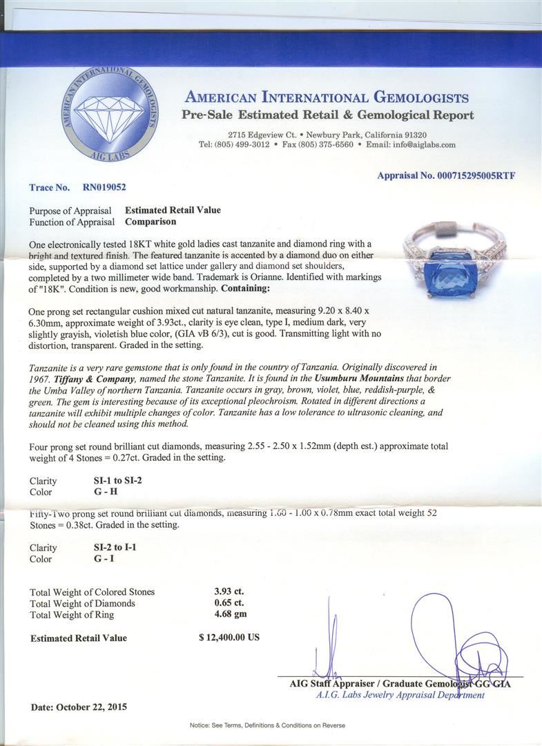 One electronically tested 18KT white gold ladies cast tanzanite and diamond ring with a bright and textured finish. The featured tanzanite is accented by a diamond duo on either side, supported by a diamond set lattice under gallery and diamond set shoulders, completed by a two millimeter wide band. Trademark is Orianne. Identified with markings of "18K". Condition is new, good workmanship. Containing: One prong set rectangular cushion mixed cut natural tanzanite, measuring 9.20 x 8.40 x 6.30mm, approximate weight of 3.93ct., clarity is eye clean, type I, medium dark, very slightly grayish, violetish blue color, (GIA vB 6/3), cut is good. Transmitting light with no distortion, transparent. Graded in the setting. Tanzanite is a very rare gemstone that is only found in the country of Tanzania. Originally discovered in 1967. Tiffany & Company, named the stone Tanzanite. It is found in the Usumburu Mountains that border the Umba Valley of northern Tanzania. Tanzanite occurs in gray, brown, violet, blue, reddish-purple, & green. The gem is interesting because of its exceptional pleochroism. Rotated in different directions a tanzanite will exhibit multiple changes of color. Tanzanite has a low tolerance to ultrasonic cleaning, and should not be cleaned using this method. Four prong set round brilliant cut diamonds, measuring 2.55 - 2.50 x 1.52mm (depth est.) approximate total weight of 4 Stones = 0.27ct. Graded in the setting. Clarity: SI-1 to SI-2. Color: G - H Fifty-Two prong set round brilliant cut diamonds, measuring 1.60 - 1.00 x 0.78mm exact total weight 52 Stones = 0.38ct. Graded in the setting. Clarity: SI-2 to I-1. Color: G - I. Total Weight of Colored Stones 3.93ct. Total Weight of Diamonds 0.65ct. Total Weight of Ring 4.68gm. AIG Appraised at $12,400.00.
