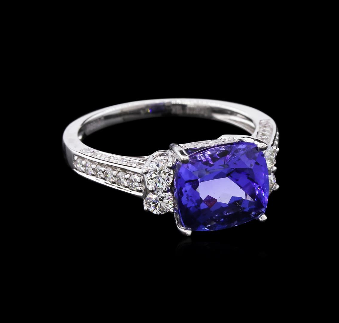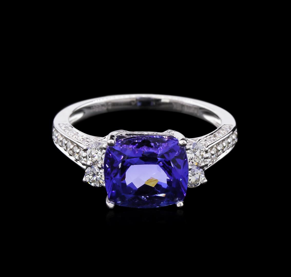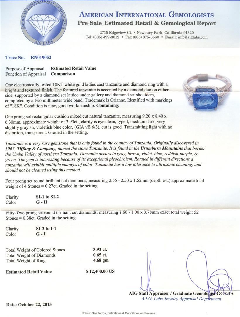One electronically tested 18KT white gold ladies cast tanzanite and diamond ring with a bright and textured finish. The featured tanzanite is accented by a diamond duo on either side, supported by a diamond set lattice under gallery and diamond set shoulders, completed by a two millimeter wide band. Trademark is Orianne. Identified with markings of "18K". Condition is new, good workmanship. Containing: One prong set rectangular cushion mixed cut natural tanzanite, measuring 9.20 x 8.40 x 6.30mm, approximate weight of 3.93ct., clarity is eye clean, type I, medium dark, very slightly grayish, violetish blue color, (GIA vB 6/3), cut is good. Transmitting light with no distortion, transparent. Graded in the setting. Tanzanite is a very rare gemstone that is only found in the country of Tanzania. Originally discovered in 1967. Tiffany & Company, named the stone Tanzanite. It is found in the Usumburu Mountains that border the Umba Valley of northern Tanzania. Tanzanite occurs in gray, brown, violet, blue, reddish-purple, & green. The gem is interesting because of its exceptional pleochroism. Rotated in different directions a tanzanite will exhibit multiple changes of color. Tanzanite has a low tolerance to ultrasonic cleaning, and should not be cleaned using this method. Four prong set round brilliant cut diamonds, measuring 2.55 - 2.50 x 1.52mm (depth est.) approximate total weight of 4 Stones = 0.27ct. Graded in the setting. Clarity: SI-1 to SI-2. Color: G - H Fifty-Two prong set round brilliant cut diamonds, measuring 1.60 - 1.00 x 0.78mm exact total weight 52 Stones = 0.38ct. Graded in the setting. Clarity: SI-2 to I-1. Color: G - I. Total Weight of Colored Stones 3.93ct. Total Weight of Diamonds 0.65ct. Total Weight of Ring 4.68gm. AIG Appraised at $12,400.00.