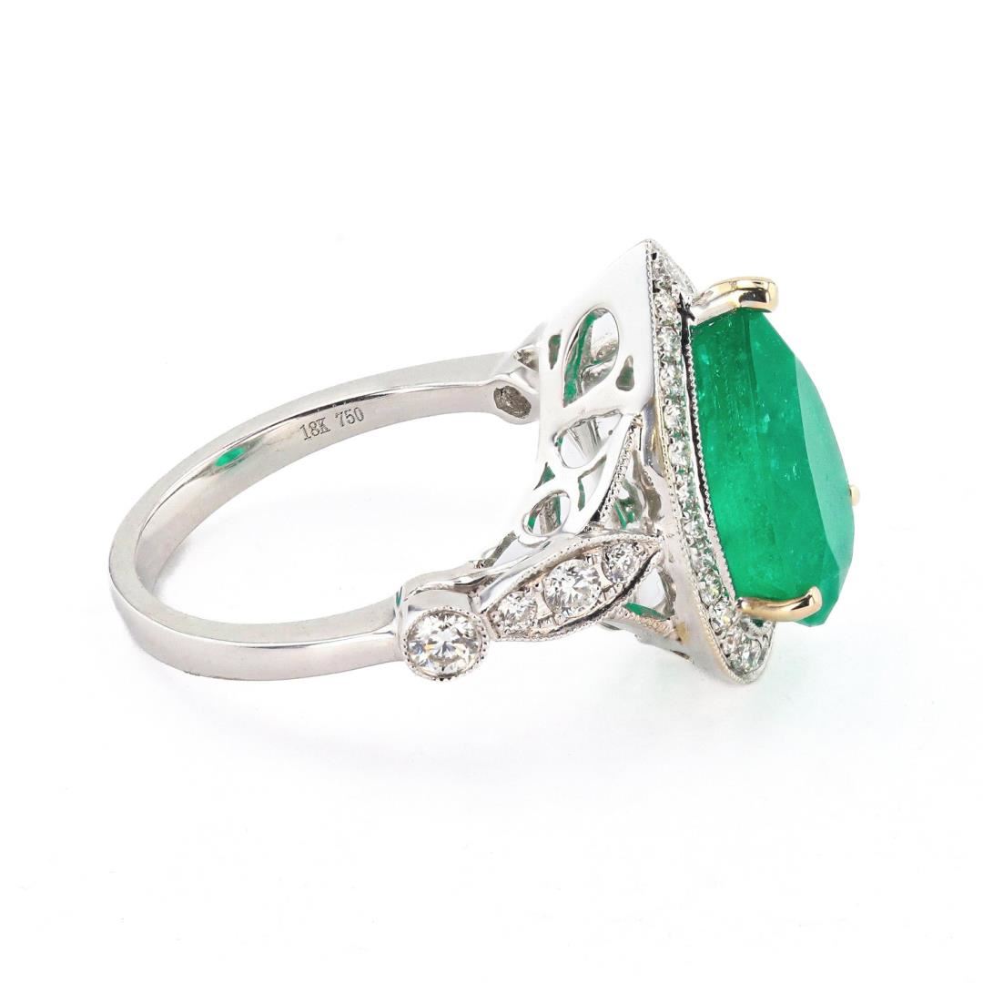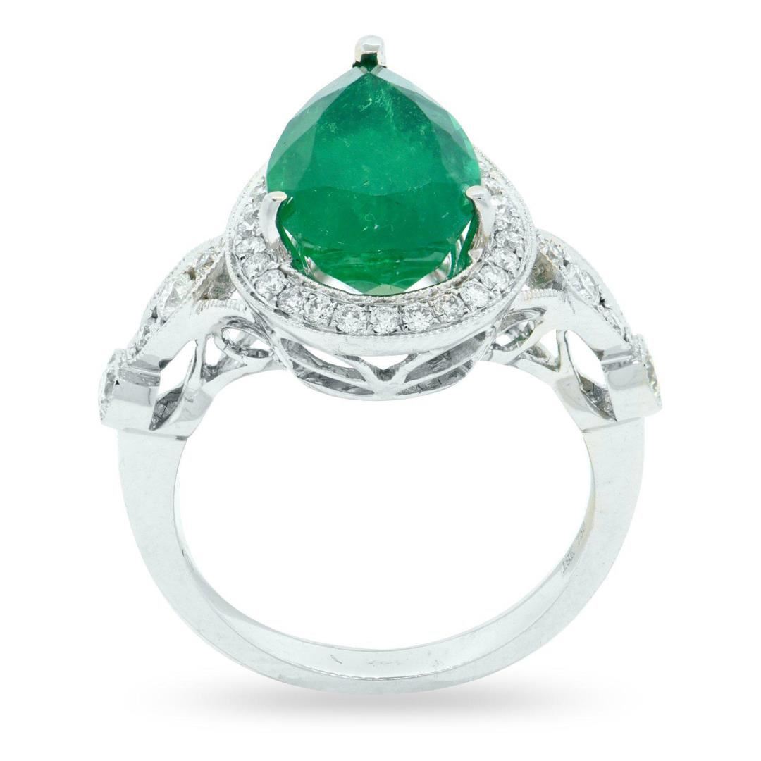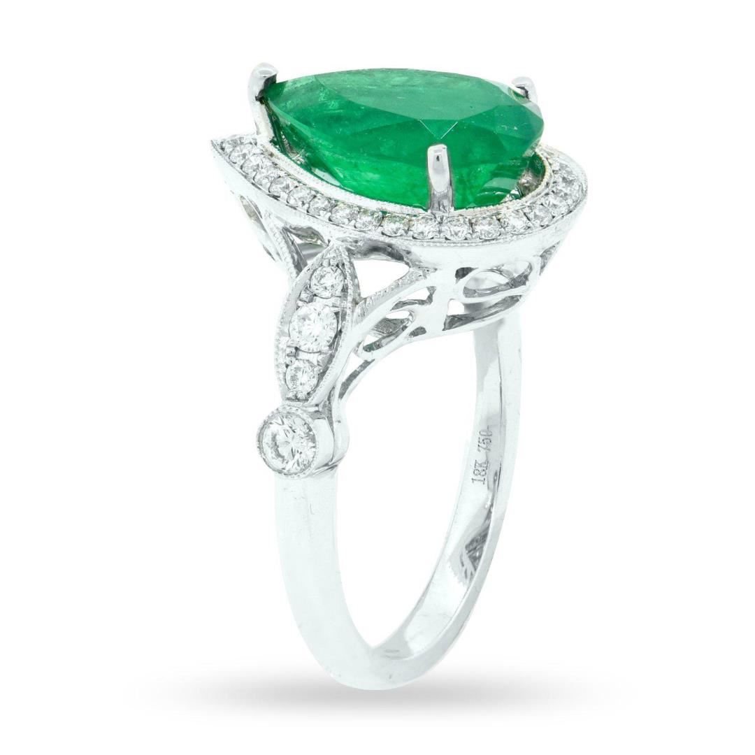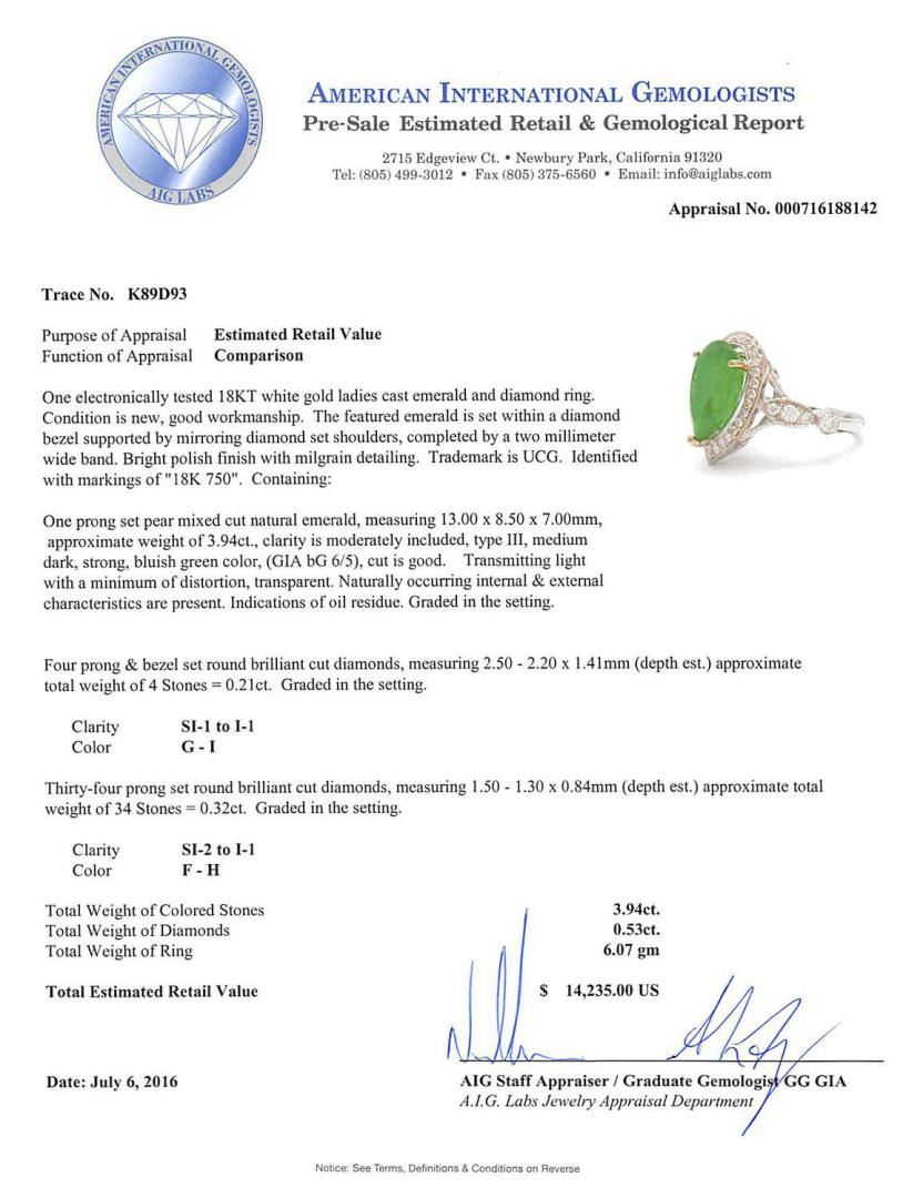 One electronically tested 18KT white gold ladies cast emerald and diamond ring. Condition is new, good workmanship. The featured emerald is set within a diamond bezel supported by mirroring diamond set shoulders, completed by a two millimeter wide band. Bright polish finish with milgrain detailing. Trademark is UCG. Identified with markings of "18K 750". Containing: One prong set pear mixed cut natural emerald, measuring 13.00 x 8.50 x 7.00mm, approximate weight of 3.94ct., clarity is moderately included, type III, medium dark, strong, bluish green color, (GIA bG 6/5), cut is good. Transmitting light with a minimum of distortion, transparent. Naturally occurring internal & external characteristics are present. Indications of oil residue. Graded in the setting. Four prong & bezel set round brilliant cut diamonds, measuring 2.50 - 2.20 x 1.41mm (depth est.) approximate total weight of 4 Stones = 0.21ct. Graded in the setting. Clarity: SI-1 to I-1 Color: G-I Thirty-four prong set round brilliant cut diamonds, measuring 1.50 - 1.30 x 0.84mm (depth est.) approximate total weight of 34 Stones = 0.32ct. Graded in the setting. Clarity: SI-2 to I-1 Color: F-H Total Weight of Colored Stones: 3.94ct. Total Weight of Diamonds: 0.53ct. Total Weight of Ring: 6.07 gm Size: 6 1/2
