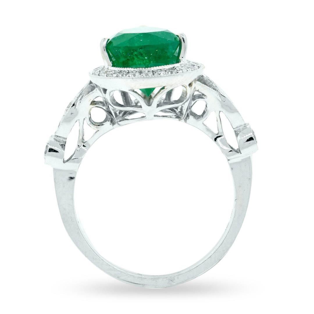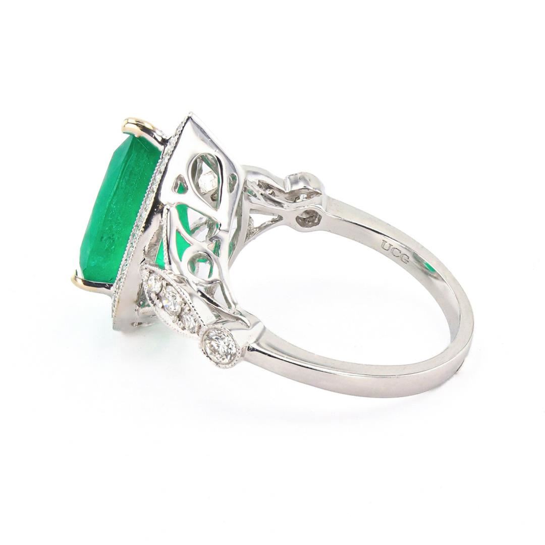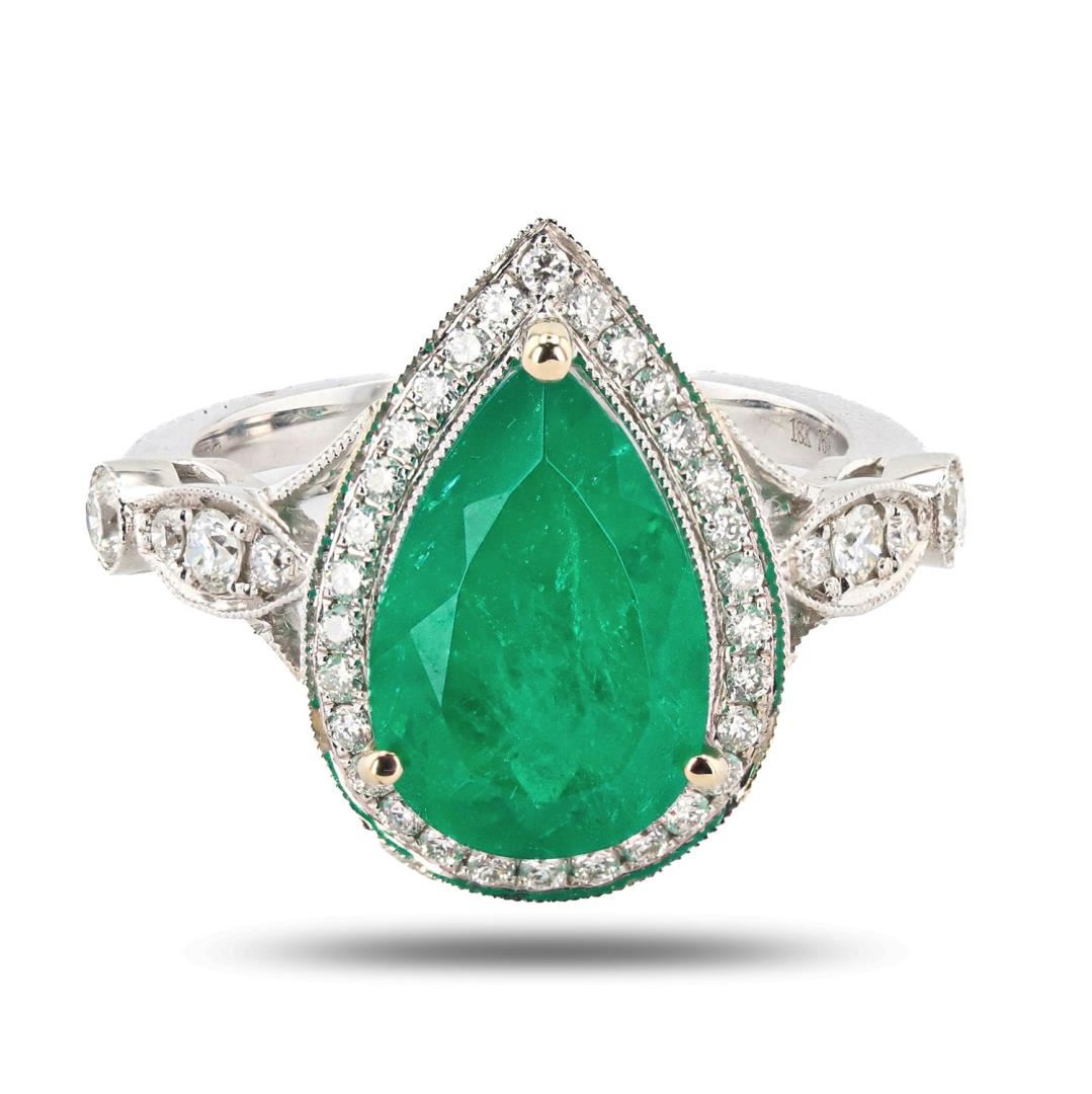 One electronically tested 18KT white gold ladies cast emerald and diamond ring. Condition is new, good workmanship. The featured emerald is set within a diamond bezel supported by mirroring diamond set shoulders, completed by a two millimeter wide band. Bright polish finish with milgrain detailing. Trademark is UCG. Identified with markings of "18K 750". Containing: One prong set pear mixed cut natural emerald, measuring 13.00 x 8.50 x 7.00mm, approximate weight of 3.94ct., clarity is moderately included, type III, medium dark, strong, bluish green color, (GIA bG 6/5), cut is good. Transmitting light with a minimum of distortion, transparent. Naturally occurring internal & external characteristics are present. Indications of oil residue. Graded in the setting. Four prong & bezel set round brilliant cut diamonds, measuring 2.50 - 2.20 x 1.41mm (depth est.) approximate total weight of 4 Stones = 0.21ct. Graded in the setting. Clarity: SI-1 to I-1 Color: G-I Thirty-four prong set round brilliant cut diamonds, measuring 1.50 - 1.30 x 0.84mm (depth est.) approximate total weight of 34 Stones = 0.32ct. Graded in the setting. Clarity: SI-2 to I-1 Color: F-H Total Weight of Colored Stones: 3.94ct. Total Weight of Diamonds: 0.53ct. Total Weight of Ring: 6.07 gm Size: 6 1/2
