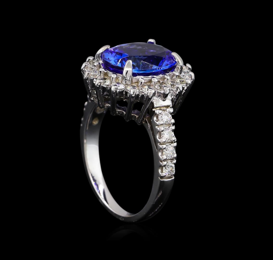One electronically tested 14KT white gold lady's cast fashion ring with a basket halo with a bright polish finish. The featured lady's ring has a shank measuring 2.05 millimeters wide. Identified with markings of "K14". Condition is new, good workmanship. Containing: One prong set oval modified brilliant cut natural tanzanite, measuring 11.64 x 8.52 x 5.68mm, approximate weight of 3.94ct., clarity is slightly included, type I, medium dark, moderately strong, violetish blue color, (GIA vB 6/4), cut is good. Transmitting light with no distortion, transparent. Colored gemstones are presumed to have been subjected to commonly used enhancement processes. Graded in the setting. Eight prong set round brilliant cut diamonds, measuring 2.10 - 2.00 x 1.27mm (depth est.) approximate total weight of 8 Stones = 0.26ct. Graded in the setting. Clarity: SI-1 to SI-2. Color: H - I. Cut Good Eighteen prong set round brilliant cut diamonds, measuring 2.00 - 1.90 x 1.17mm (depth est.) approximate total weight of 18 Stones = 0.49ct. Graded in the setting. Clarity: SI-1 to SI-2. Color: H - I. Cut Good. Total Weight of Colored Stones 3.94ct. Total Weight of Diamonds 0.75ct. Total Weight of Ring 6.10gm. GAS Appraised at $9,030.00.