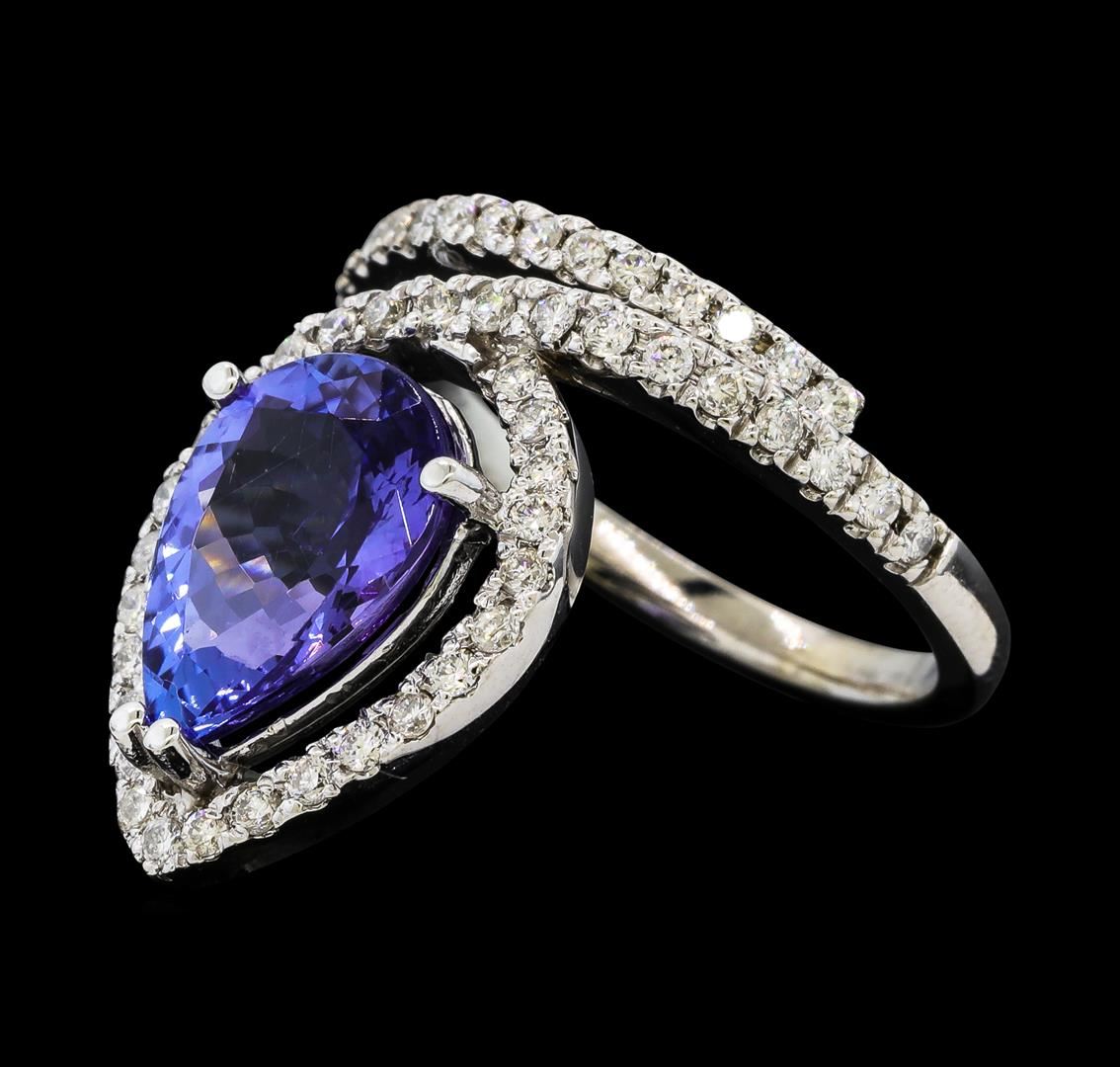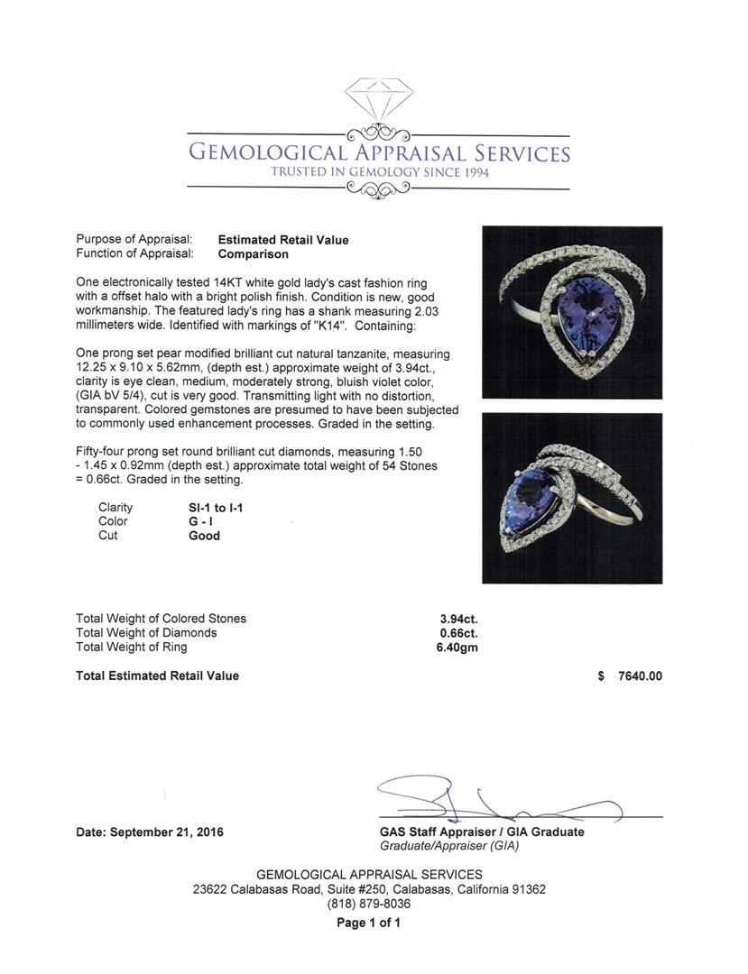 One electronically tested 14KT white gold lady's cast fashion ring with a offset halo with a bright polish finish. The featured lady's ring has a shank measuring 2.03 millimeters wide. Identified with markings of 'K14'. Condition is new, good workmanship. Containing: One prong set pear modified brilliant cut natural tanzanite, measuring 12.25 x 9.10 x 5.62mm, (depth est.) approximate weight of 3.94ct., clarity is eye clean, medium, moderately strong, bluish violet color, (GIA bV 5/4), cut is very good. Transmitting light with no distortion, transparent. Colored gemstones are presumed to have been subjected to commonly used enhancement processes. Graded in the setting. Fifty-Four prong set round brilliant cut diamonds, measuring 1.50 - 1.45 x 0.92mm (depth est.) approximate total weight of 54 Stones = 0.66ct. Graded in the setting. Clarity SI-1 to I-1. Color: G - I Cut Good. Total Weight of Colored Stones 3.94ct.. Total Weight of Diamonds 0.66ct.. Total Weight of Ring 6.40gm. GAS Appraised at $7,640.00.